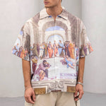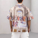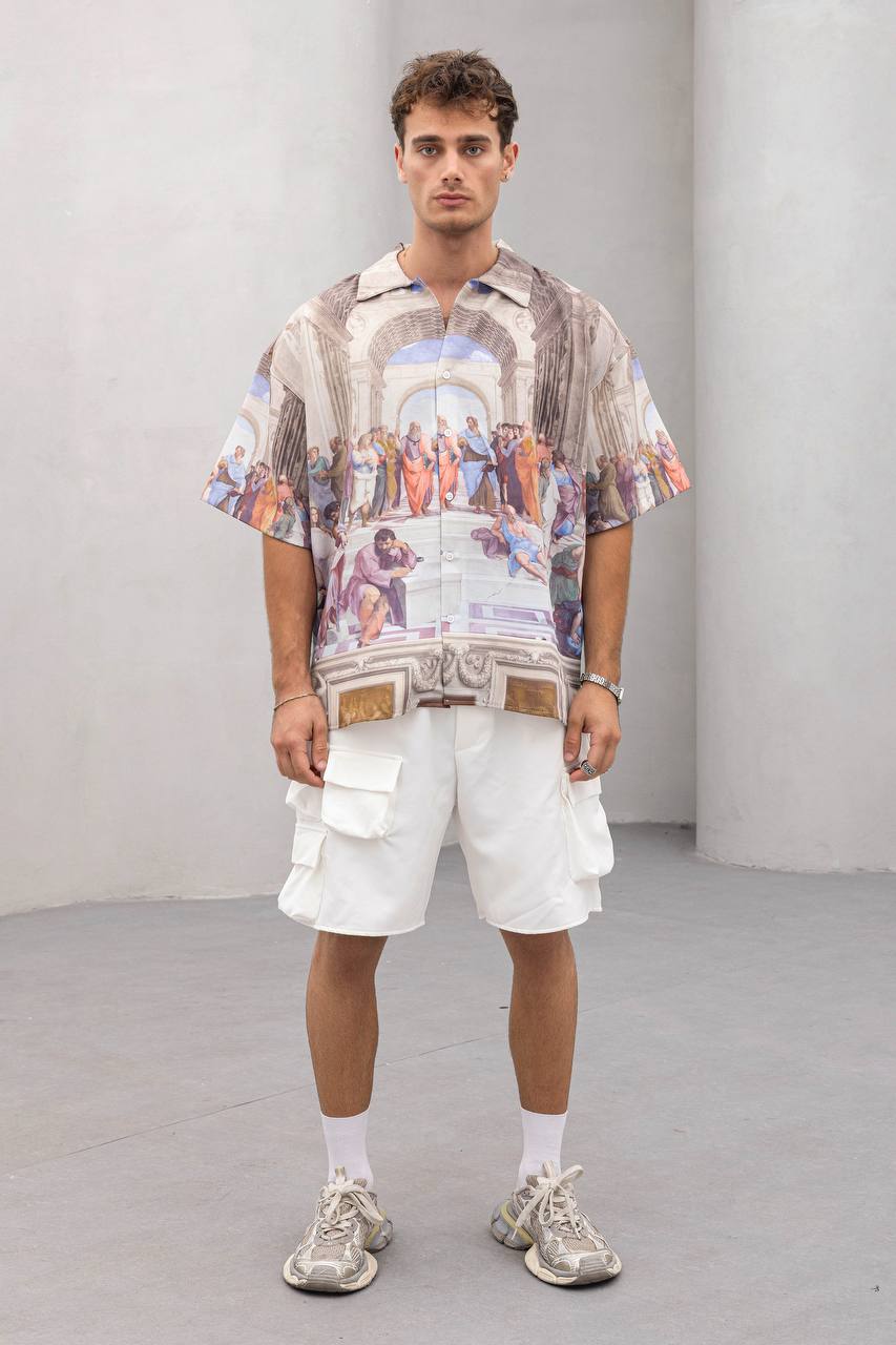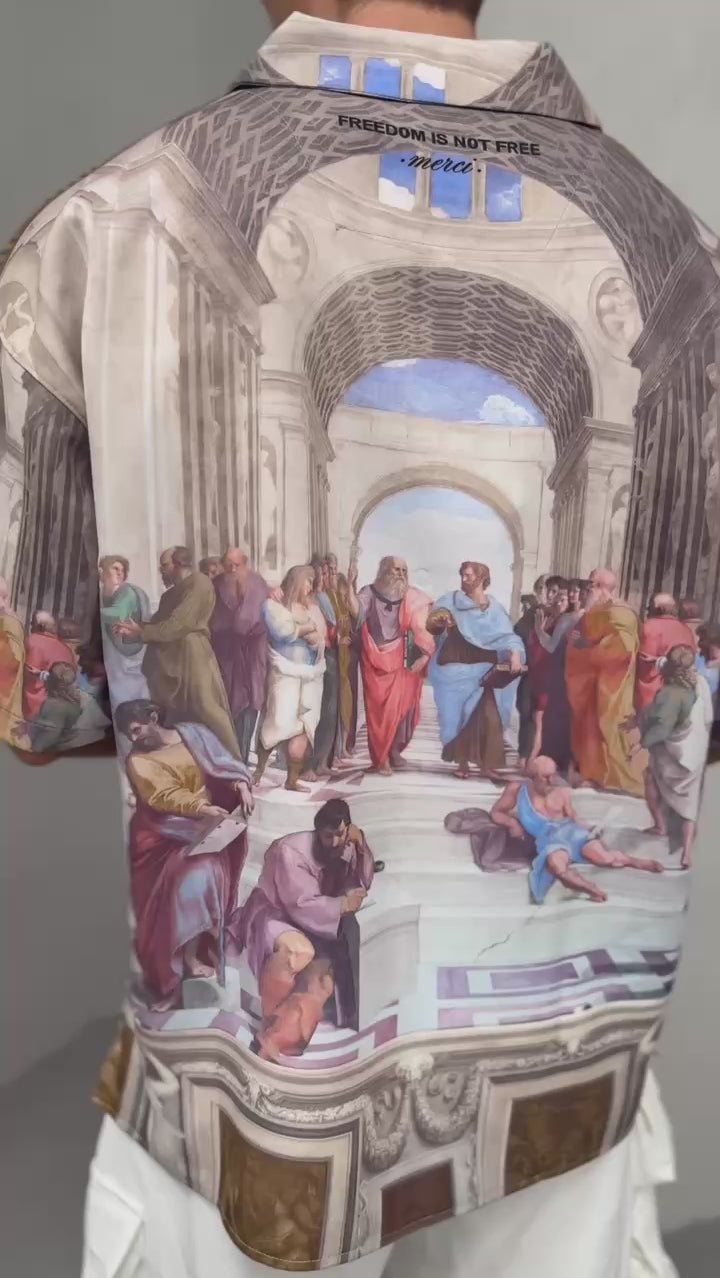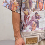 Inspirată din celebra frescă a lui Raffaello, această cămașă transformă arta clasică într-o piesă statement de garderobă. Croiala lejeră și gulerul cubanez îi conferă un aer relaxat, în timp ce imprimeul integral cu scenele filozofilor greci adaugă profunzime și originalitate. Realizată dintr-un material ușor și plăcut, cămașa se potrivește perfect atât pentru ținute casual, cât și pentru combinații smart-casual cu adevărat unice.