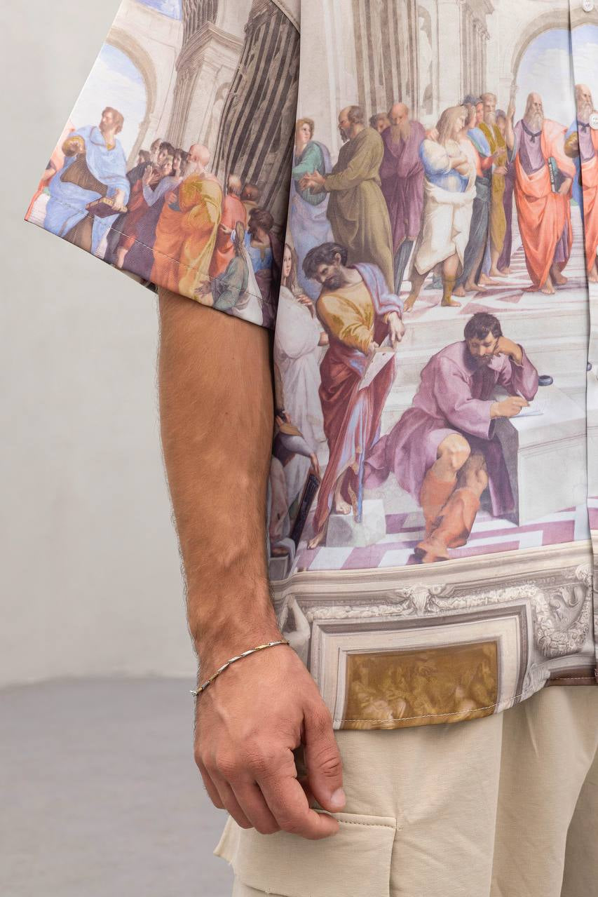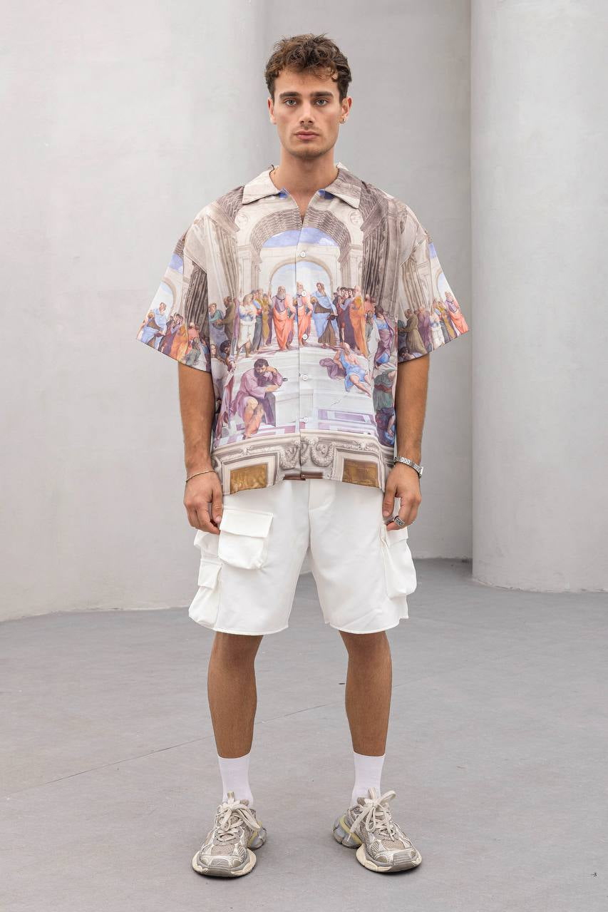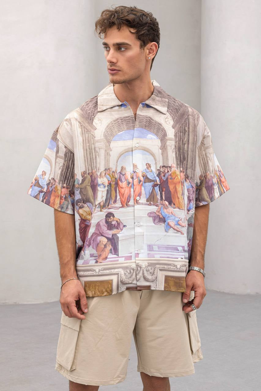 Cămașă Oversize cu Guler Cubanez și Imprimeu Renascentist