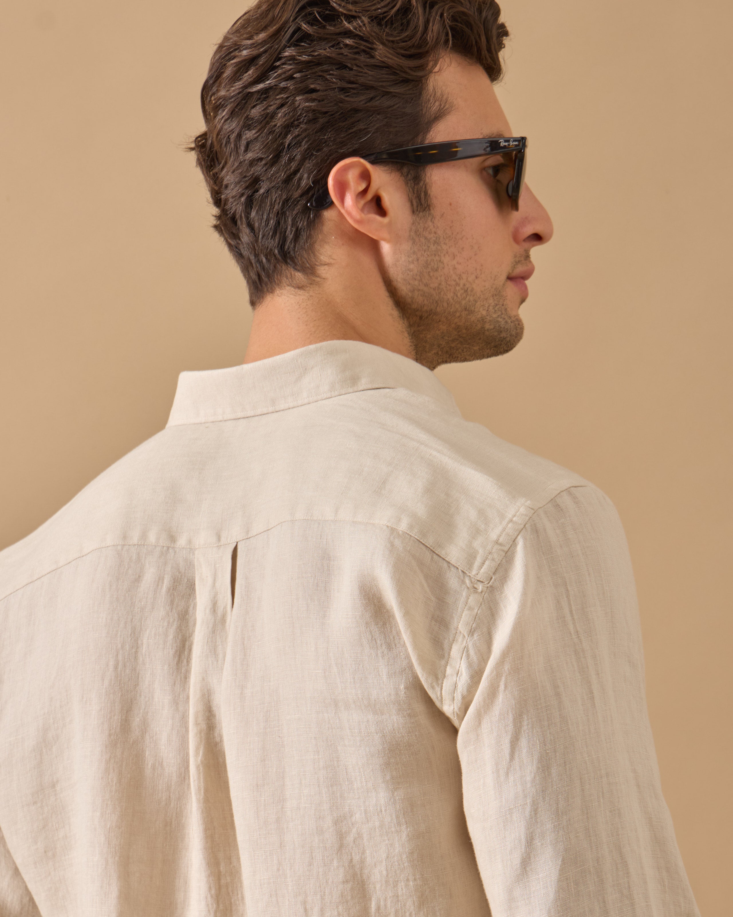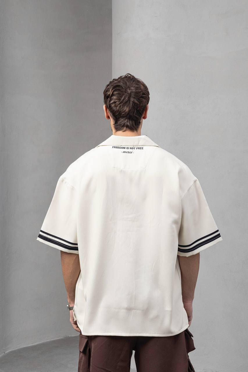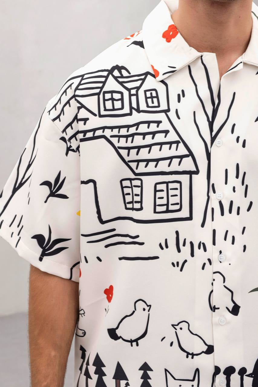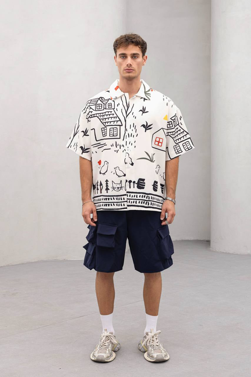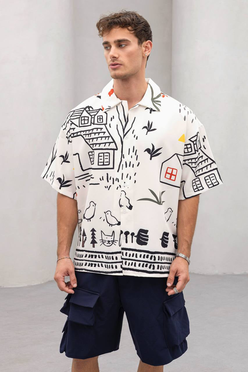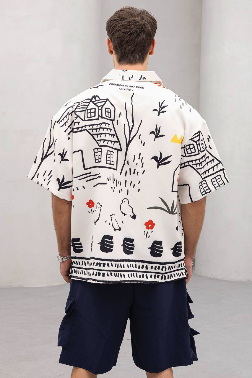 Cămașă Oversize cu Guler Cubanez – „Village Sketch” (alb-ivoire)