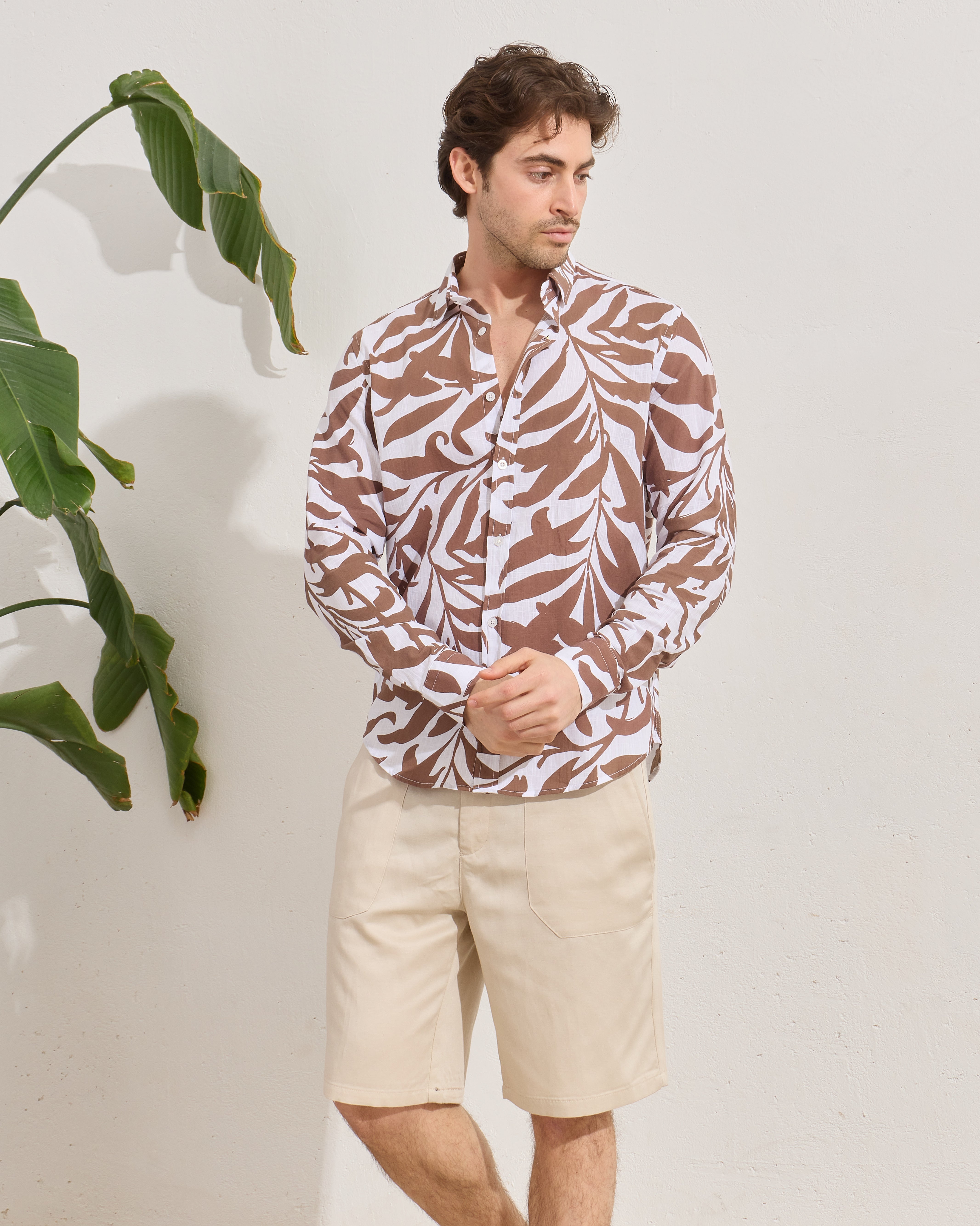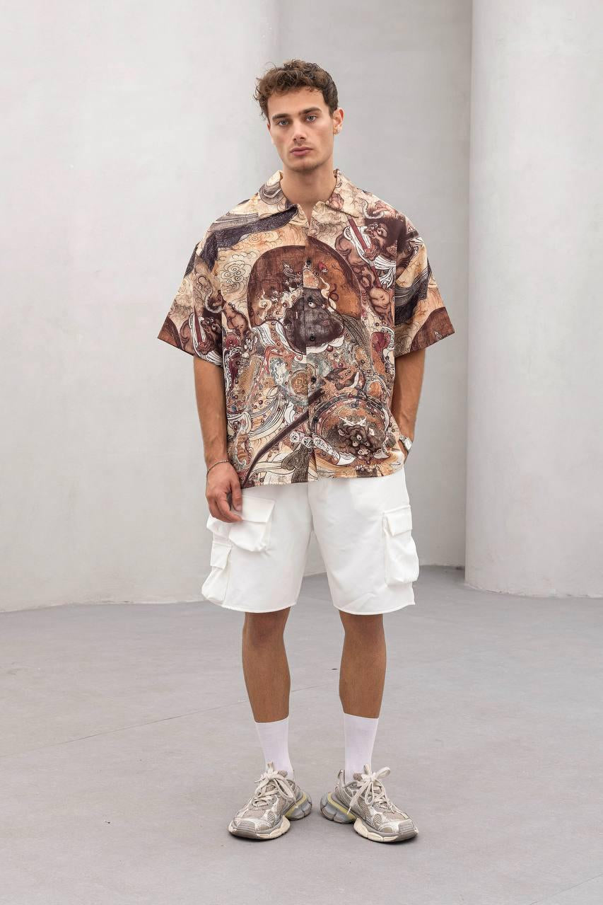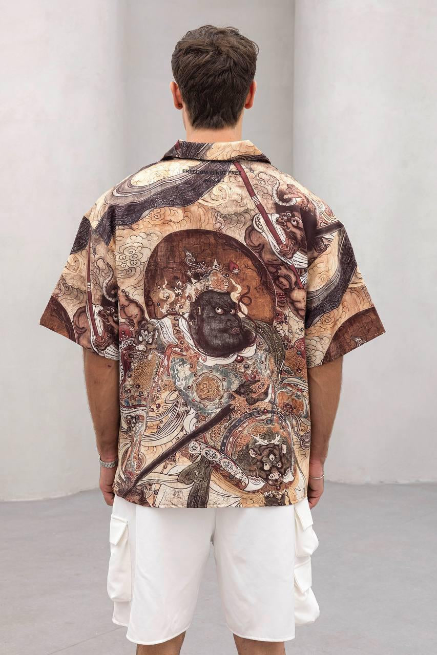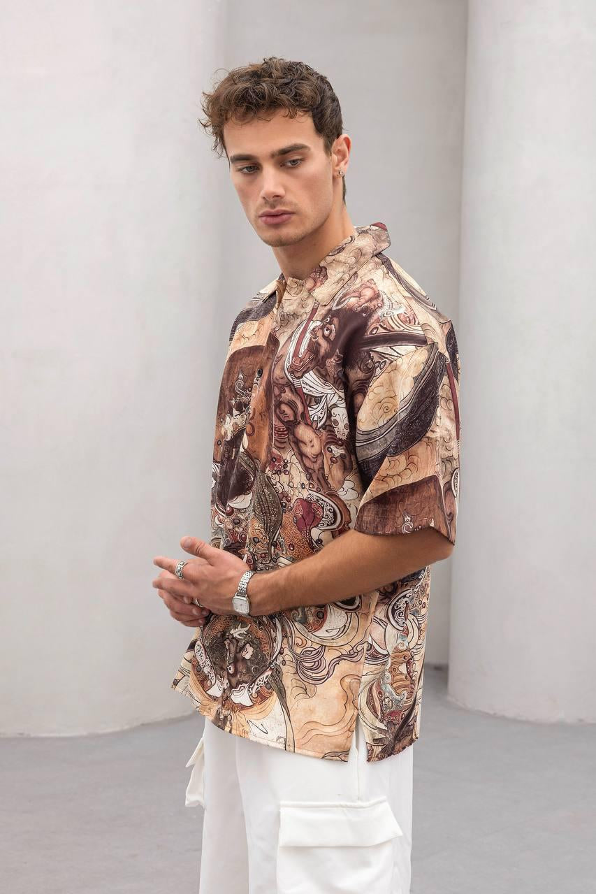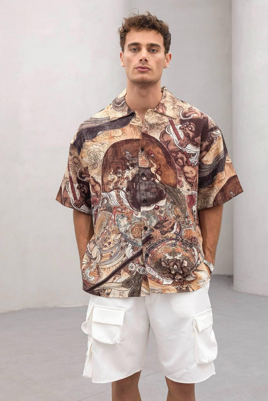 Cămașă Oversize cu Guler Cubanez și Imprimeu Mural Oriental