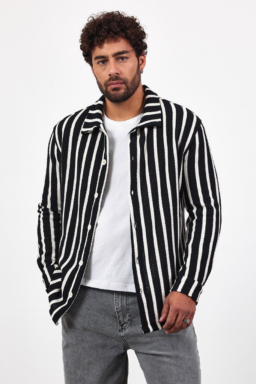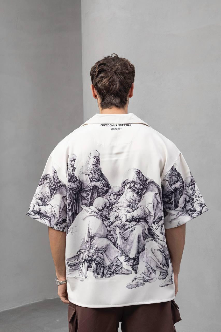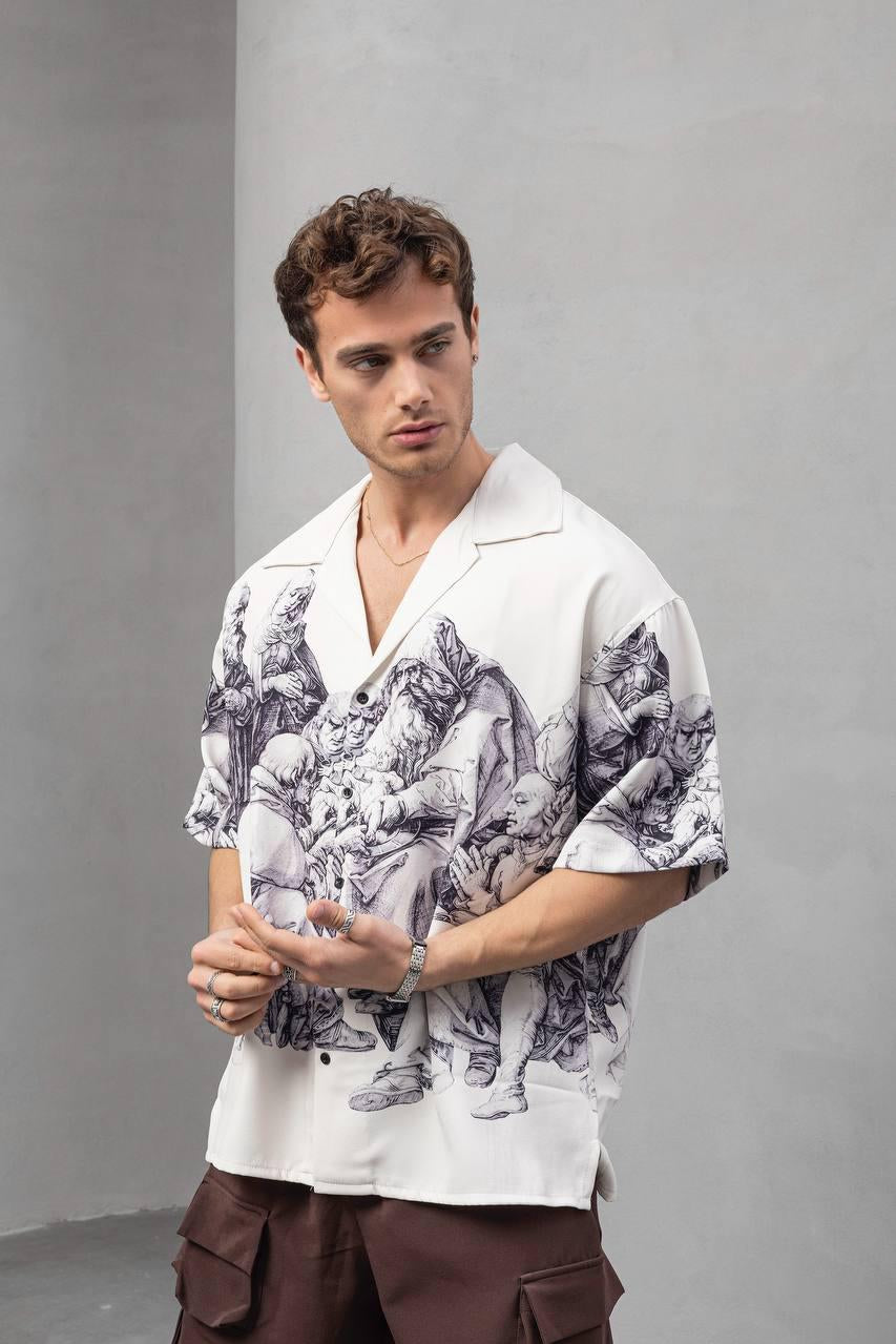 Cămașă Oversize cu Guler Cubanez – Imprimeu „Gravură Renascentistă” (alb-negru)