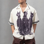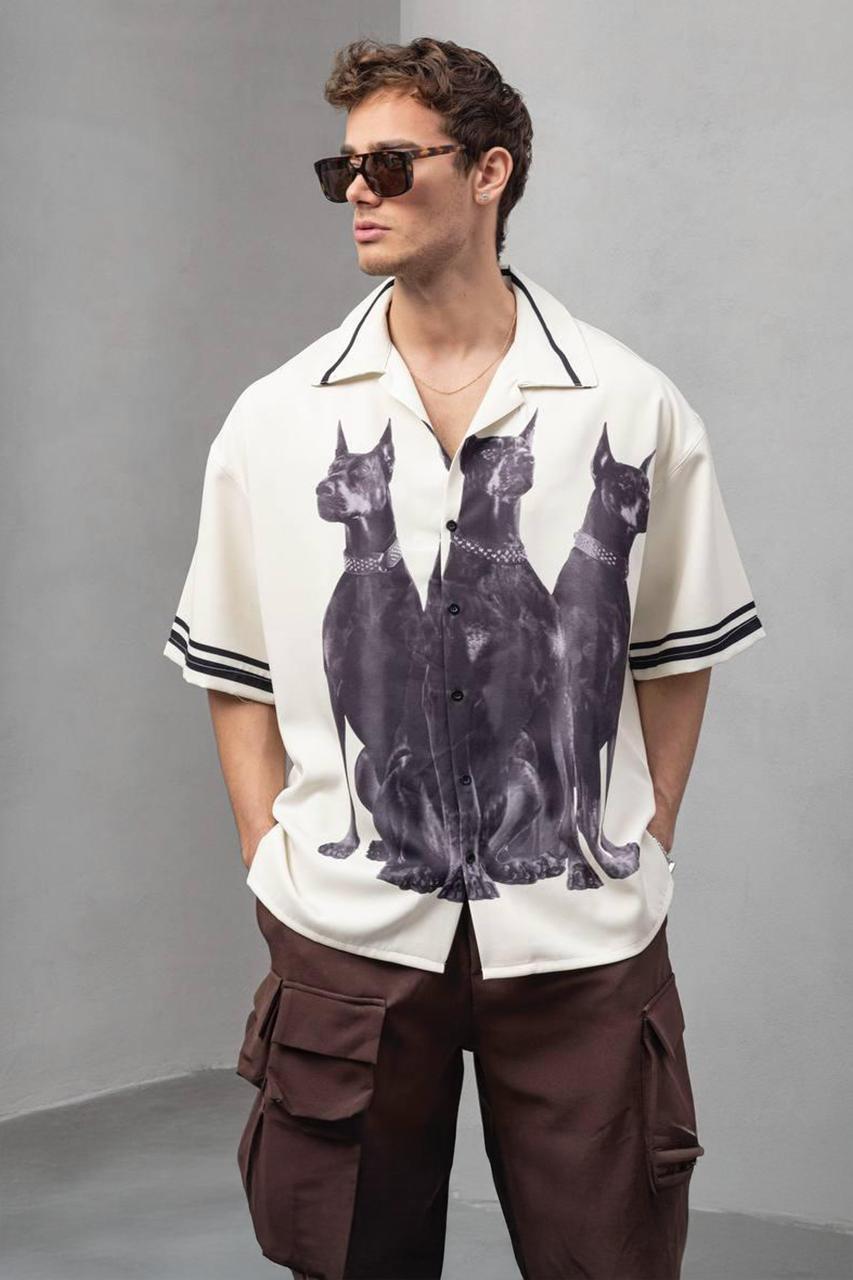 Atrage toate privirile cu o cămașă statement, inspirată de streetwear, cu imprimeu frontal spectaculos cu trei Dobermani. Croiala lejeră și gulerul cubanez îi dau un aer relaxat, perfect pentru zilele călduroase sau pentru ținute smart-casual cu atitudine. Detaliile negre în contrast pe guler și manșete adaugă un plus de stil, iar materialul cu cădere plăcută se așază impecabil peste orice siluetă. Se potrivește atât cu pantaloni cargo, cât și cu jeanși sau chinos, purtată pe deasupra pentru un look modern.