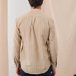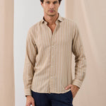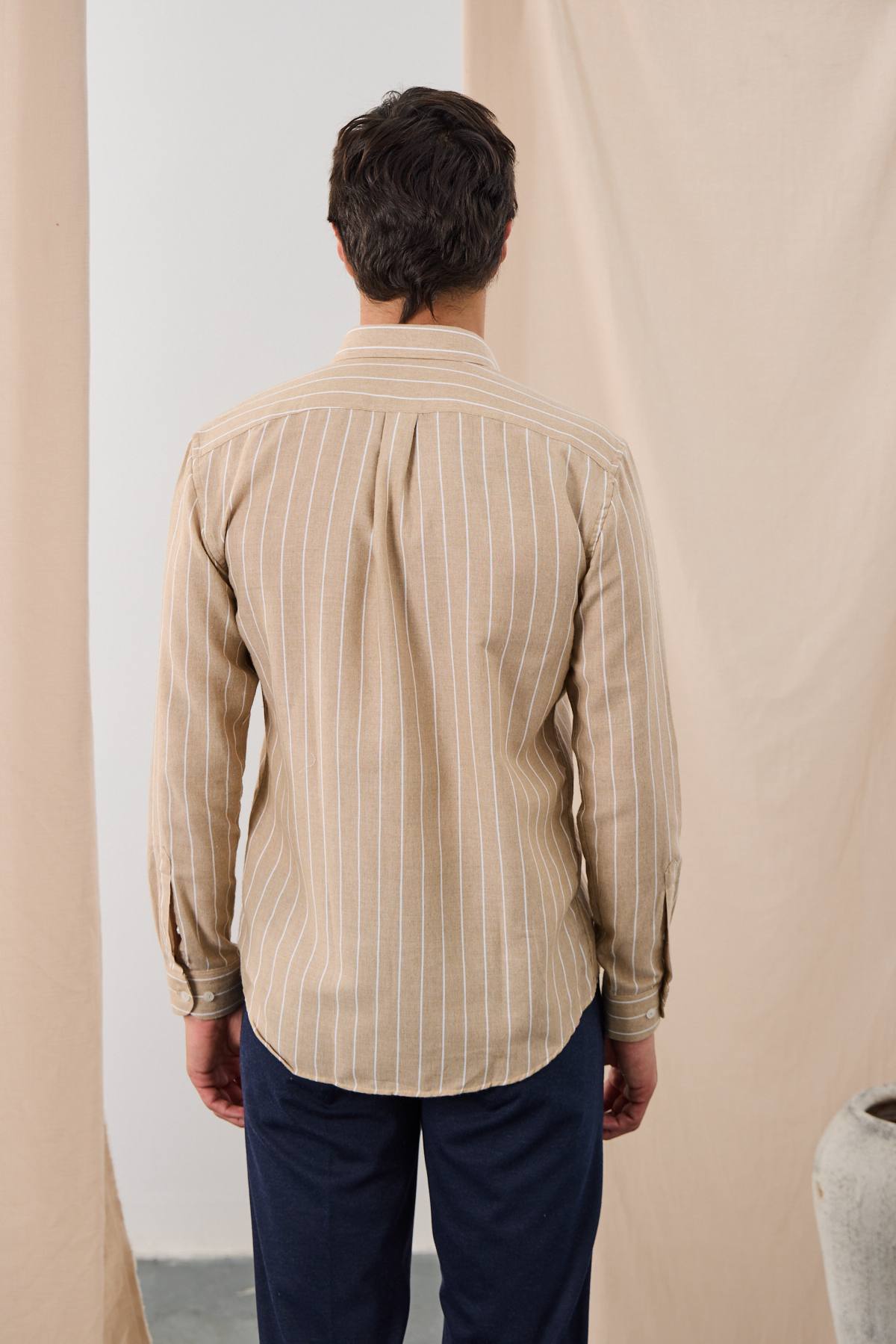 Clasică și versatilă, această cămașă Oxford în nuanță bej nisipiu cu dungi albe subțiri alungește silueta și se potrivește perfect atât la birou, cât și în ținute smart-casual.