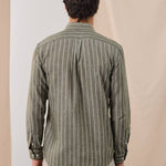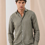 Cămașă Oxford în nuanță verde măsliniu cu dungi albe subțiri – textură ușor melanj, look fresh și versatil pentru birou sau smart-casual.