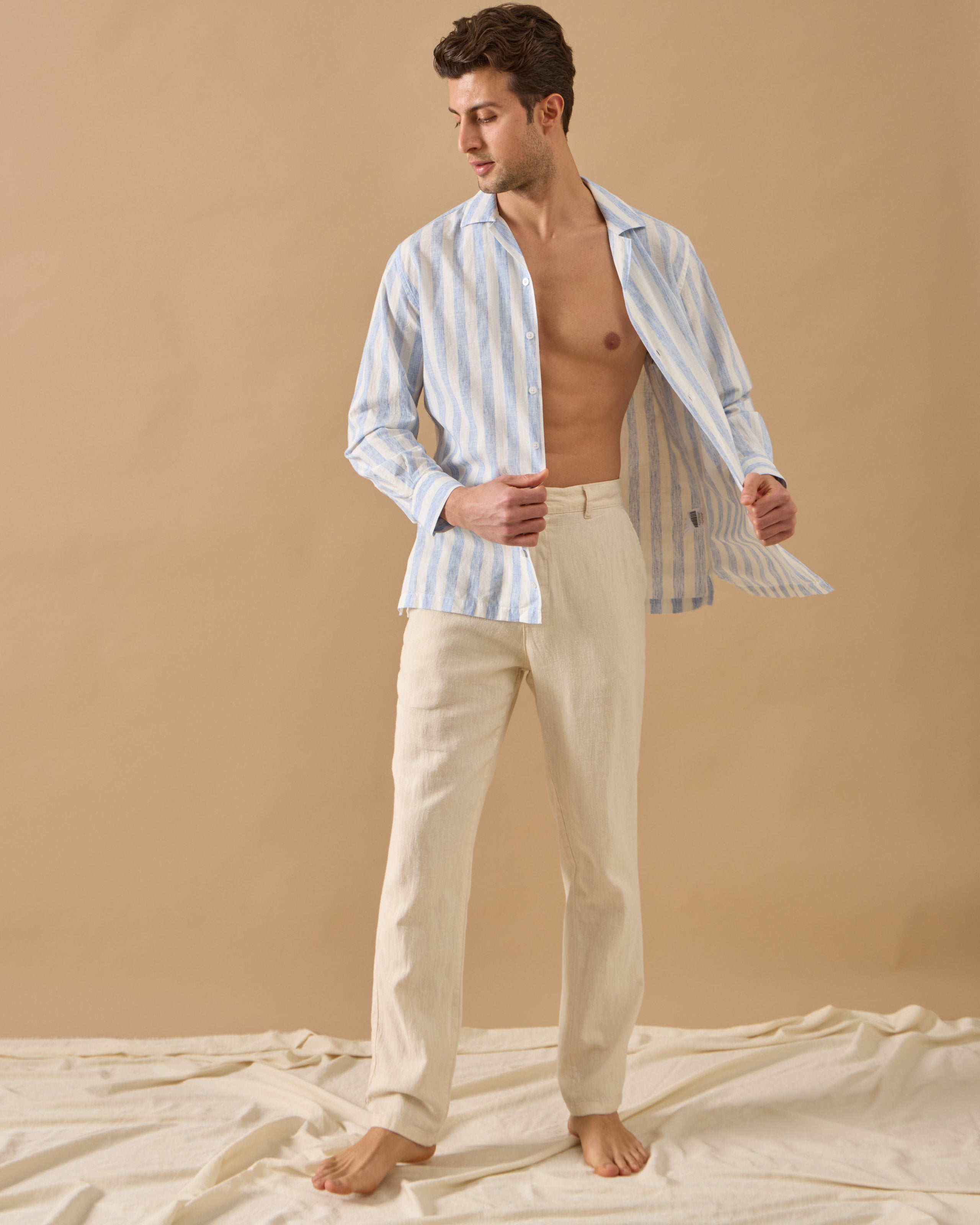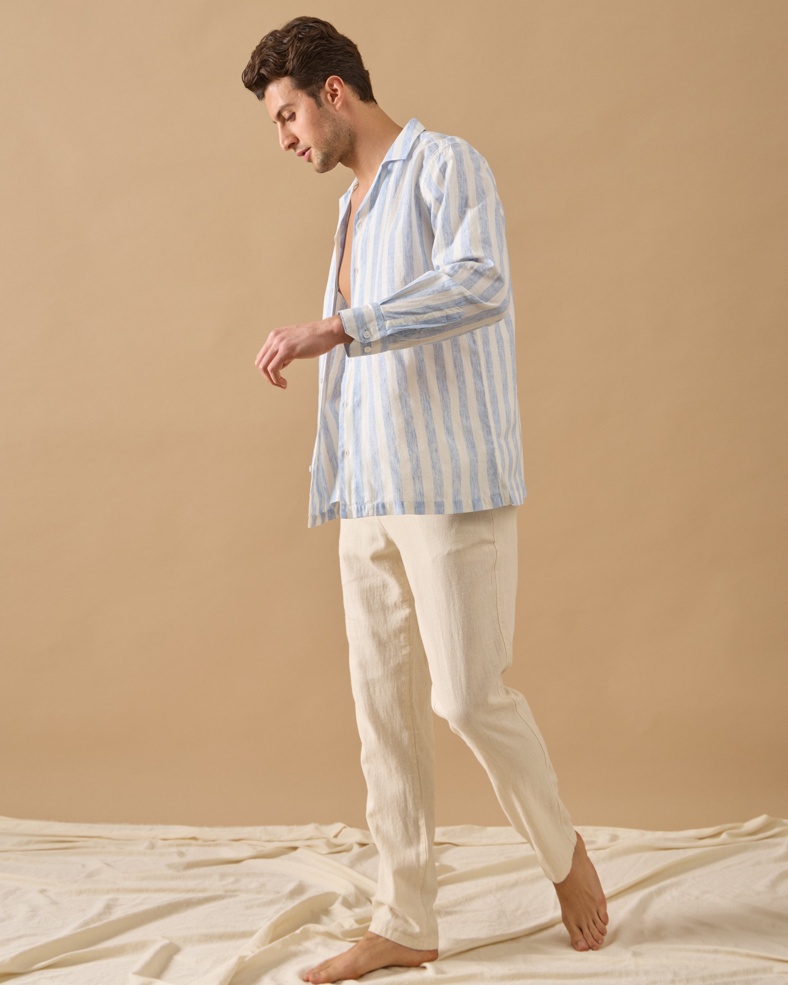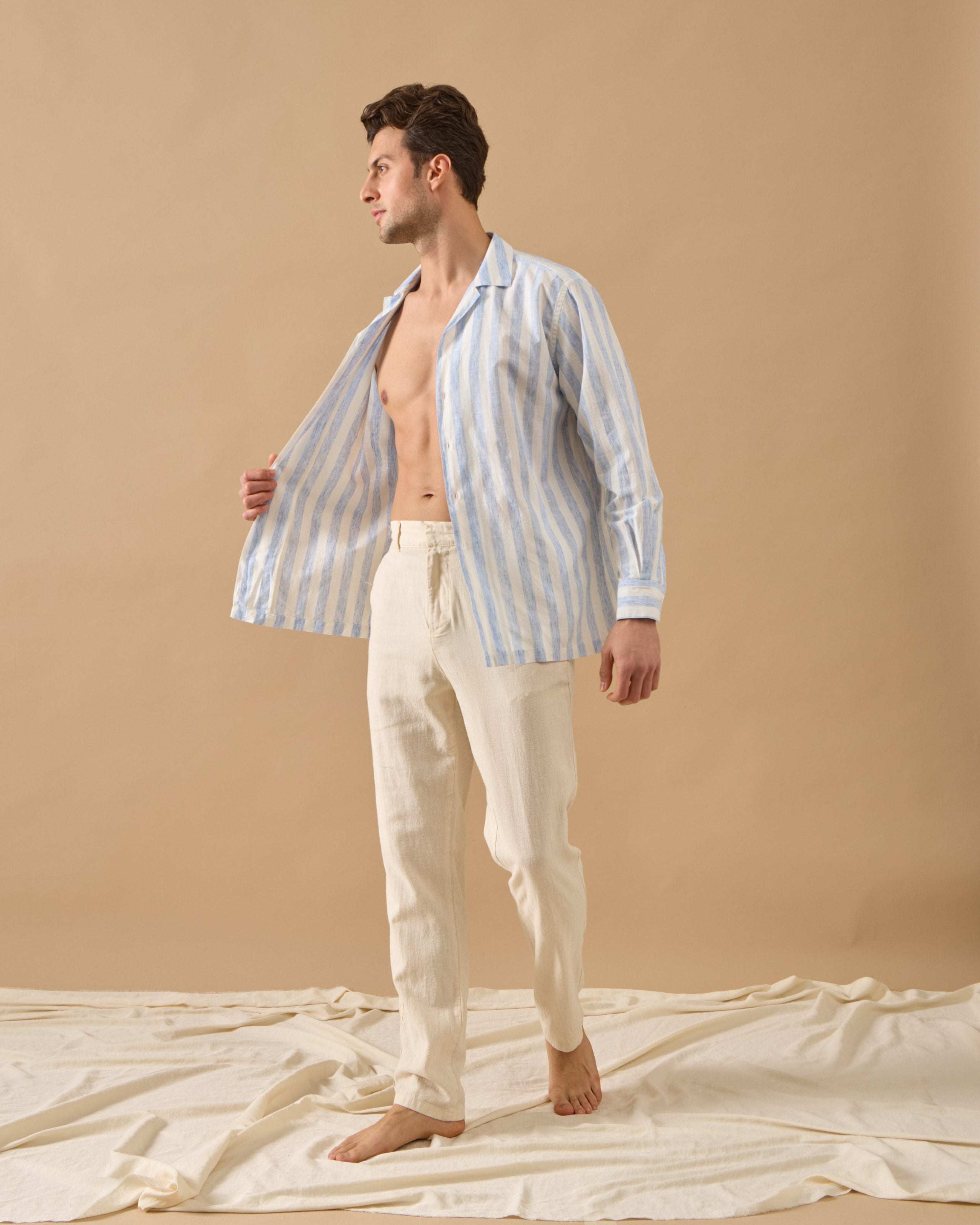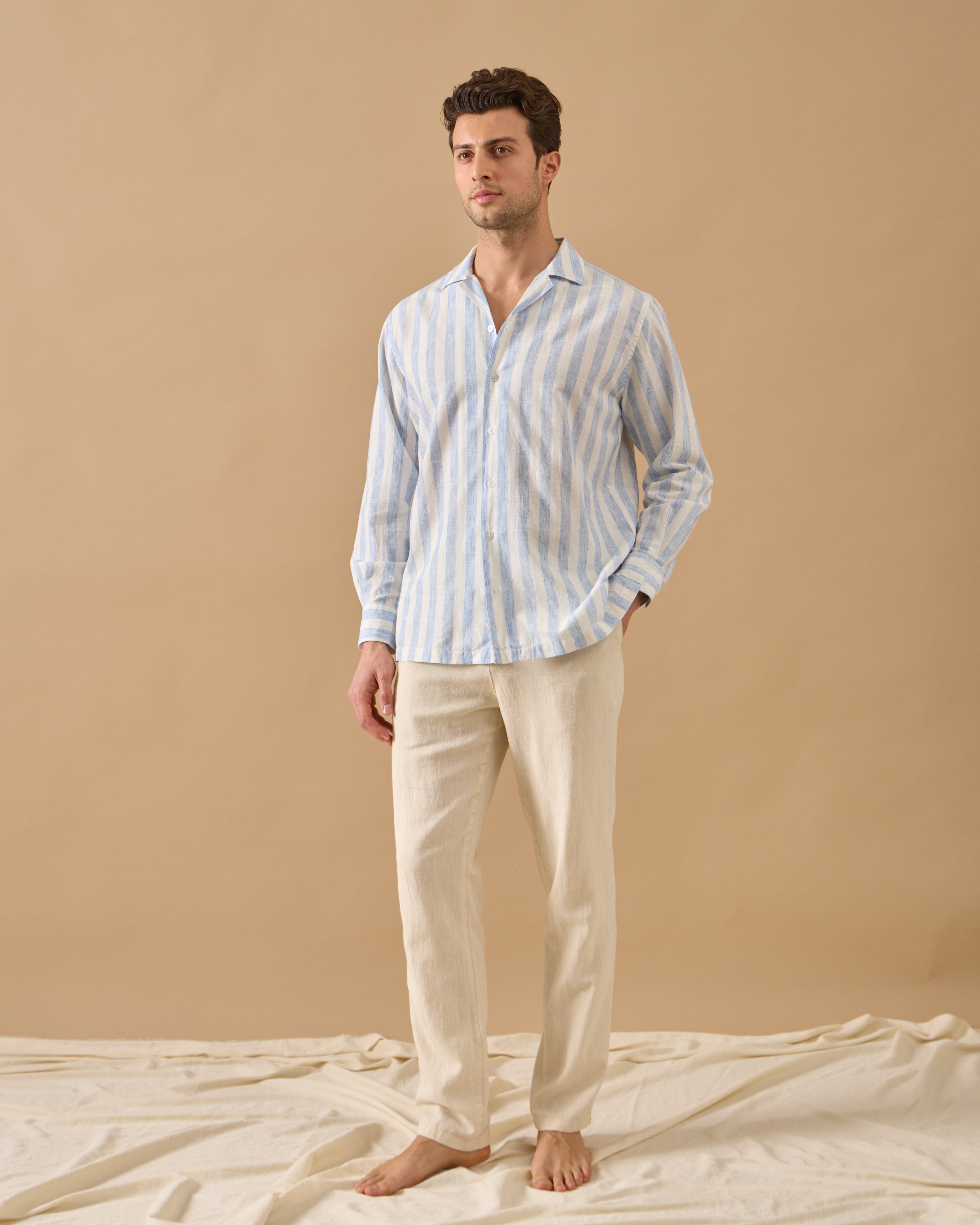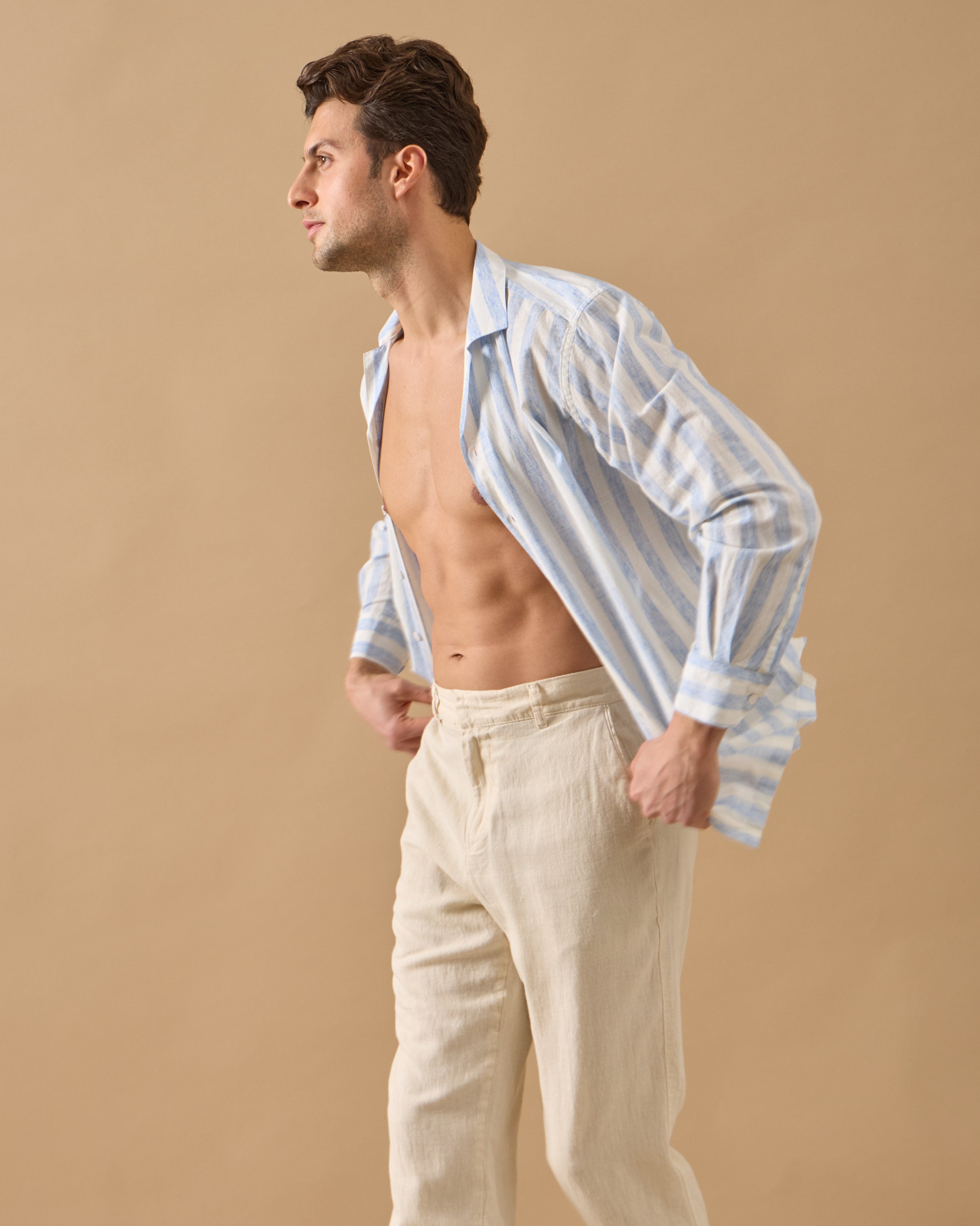 - Cămașă din in cu dungi naturale, lejeră și respirabilă.