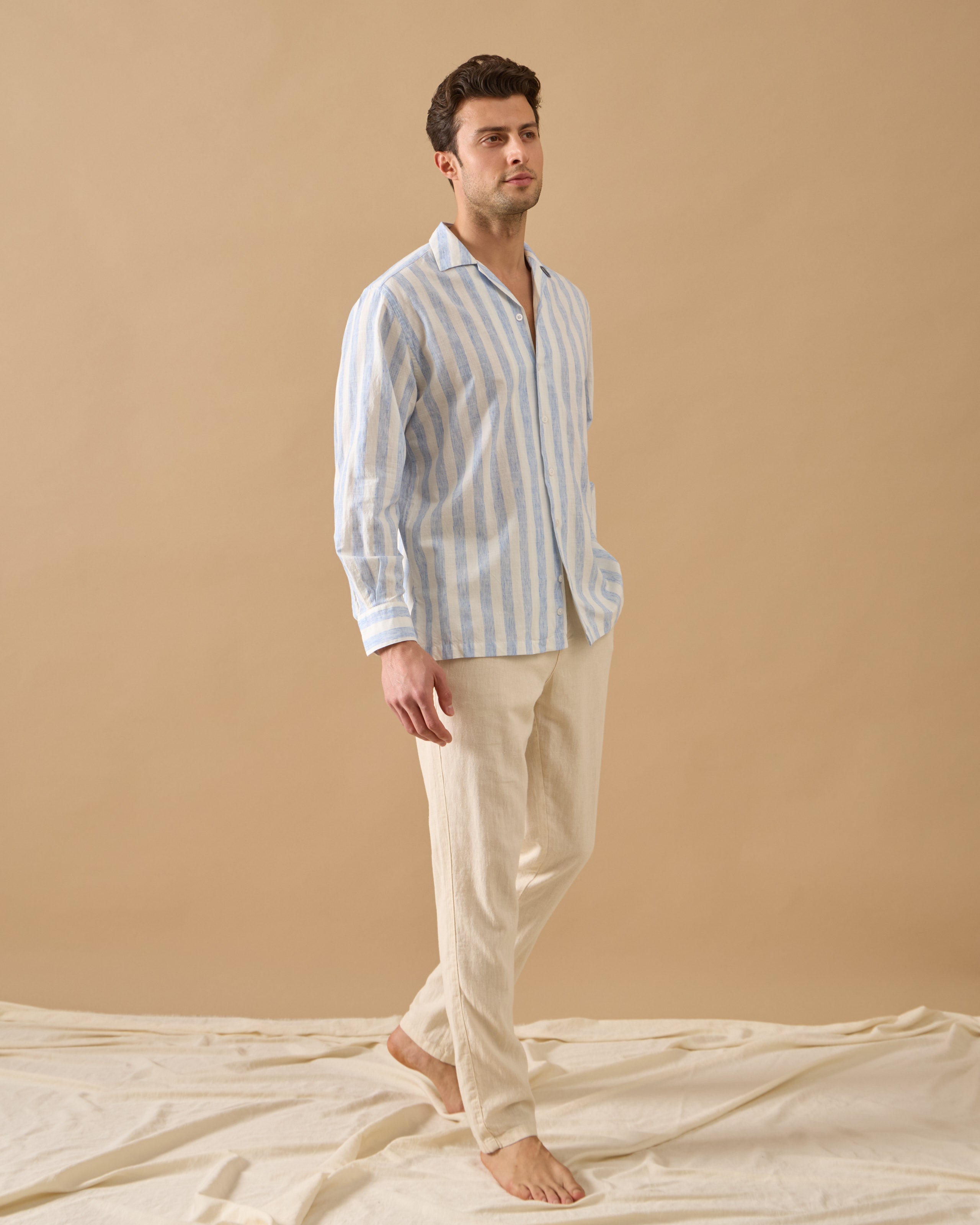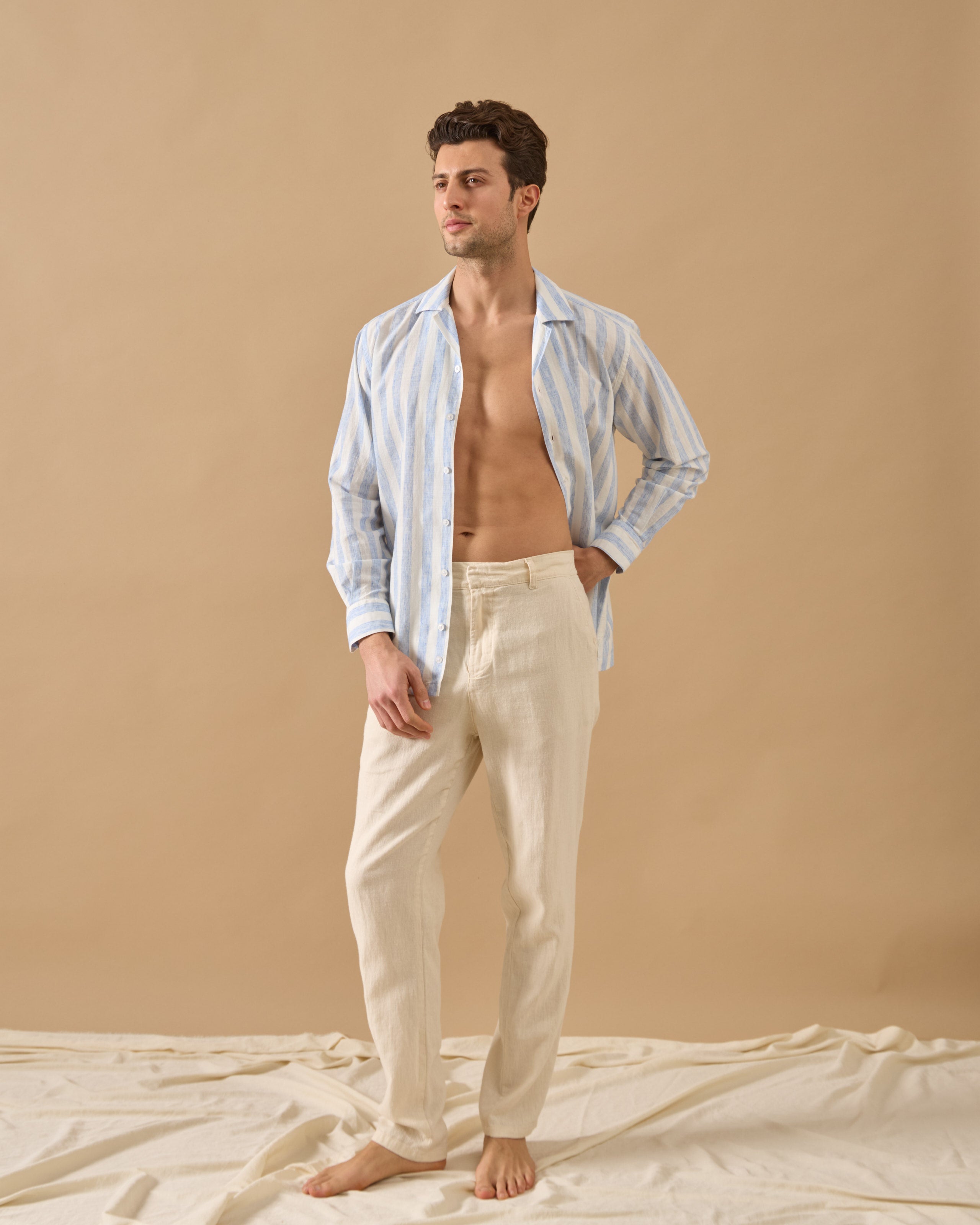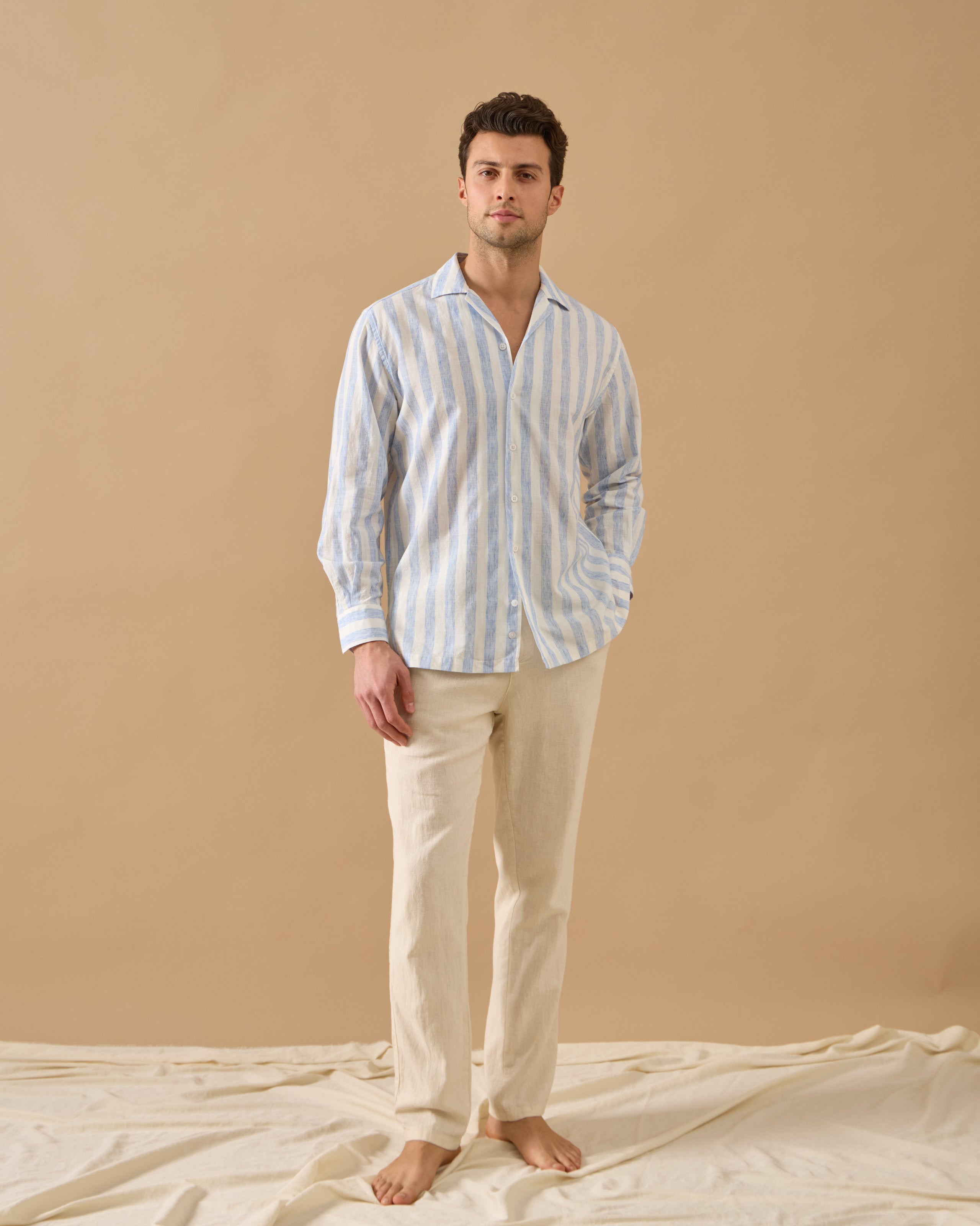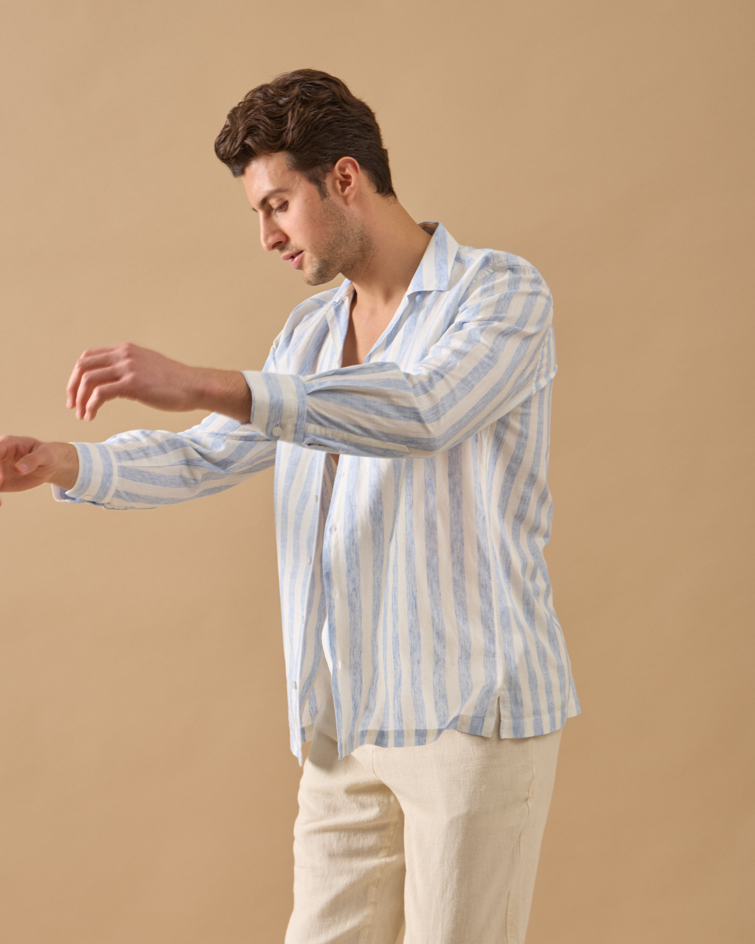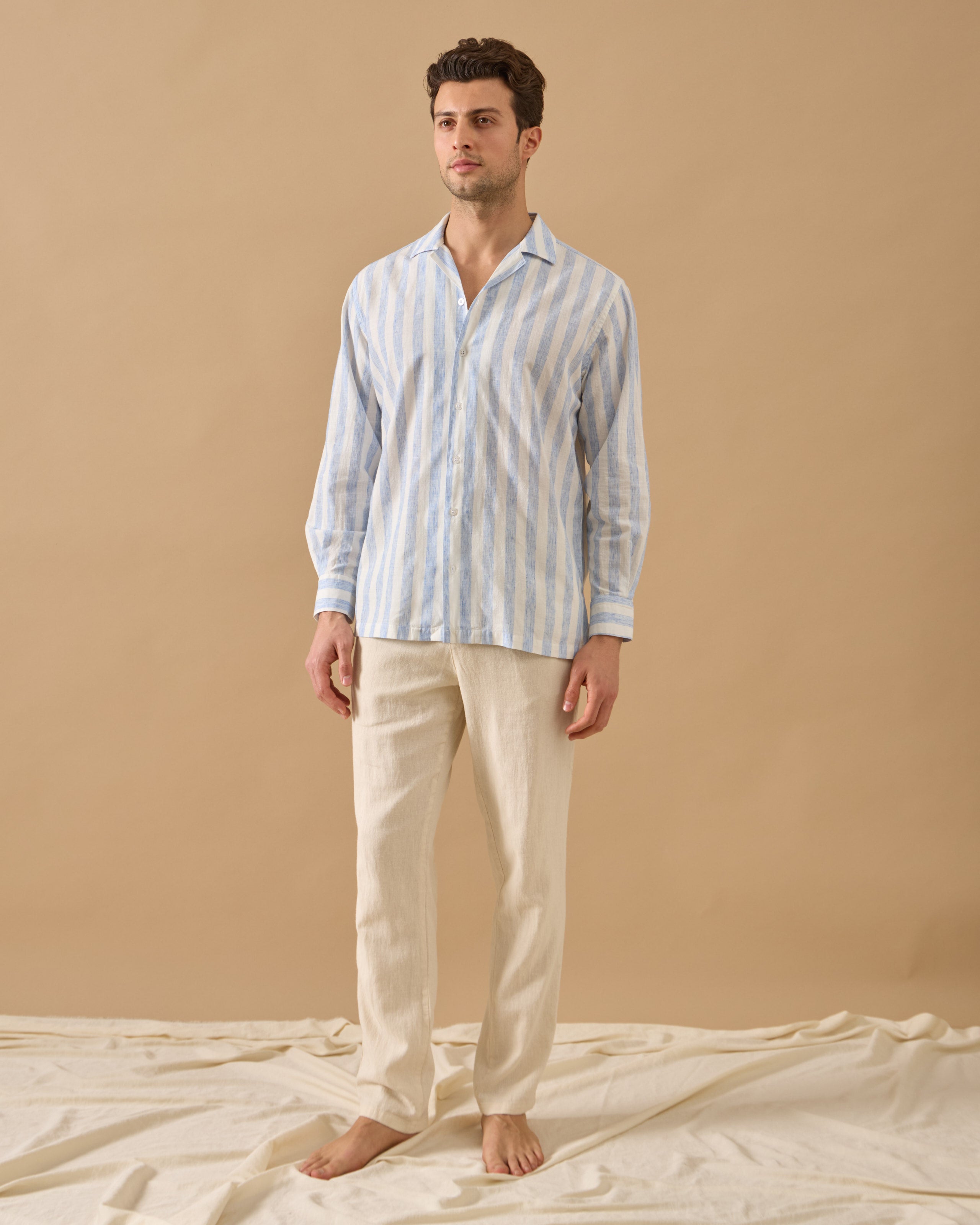 - Cămașă din in cu dungi naturale, lejeră și respirabilă.