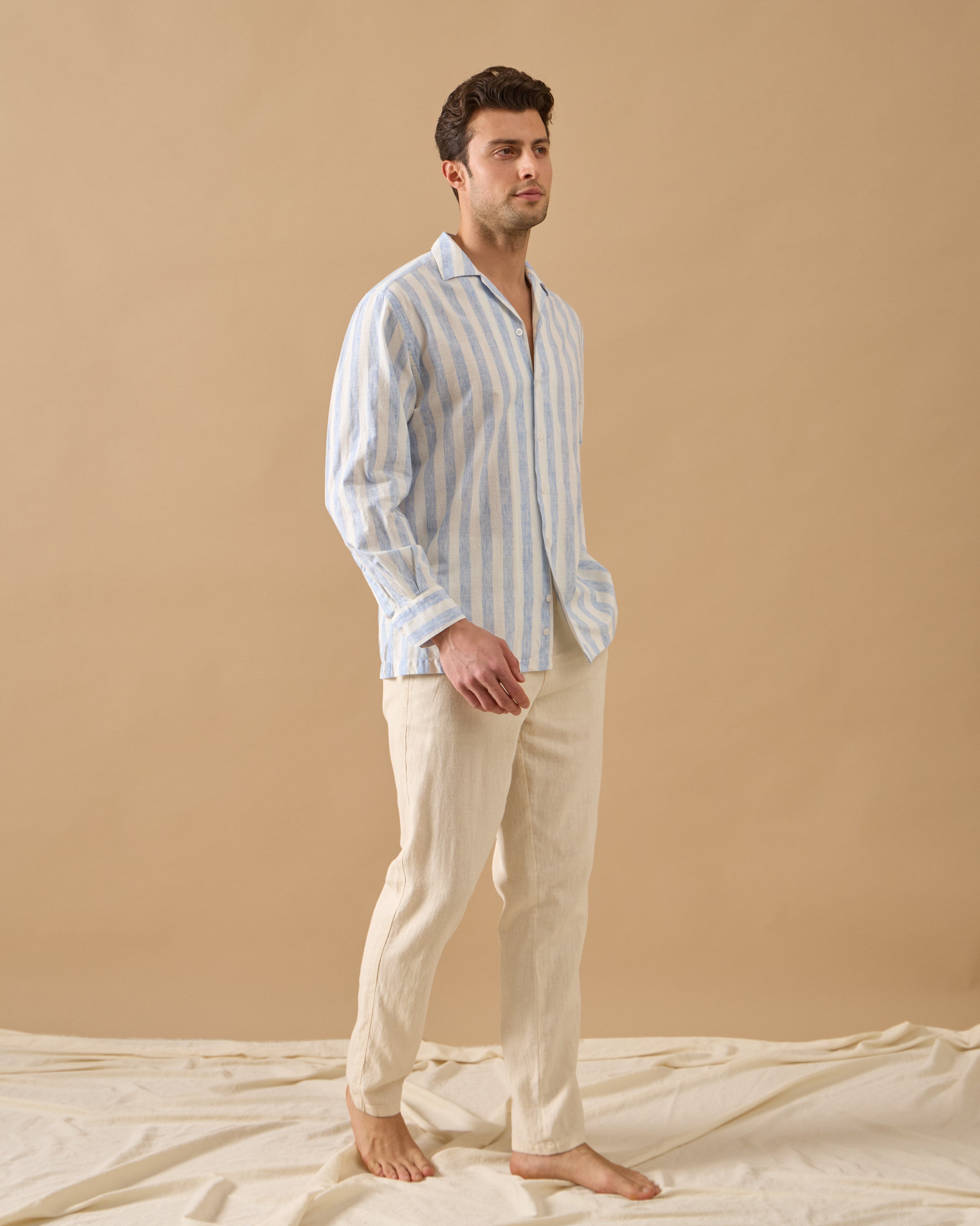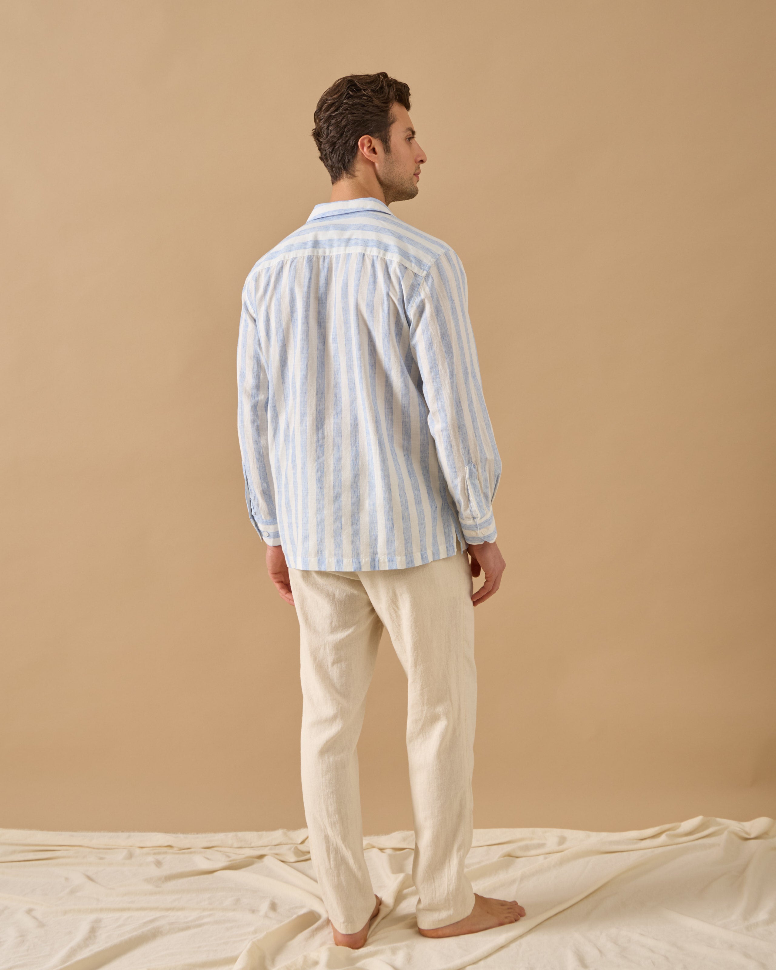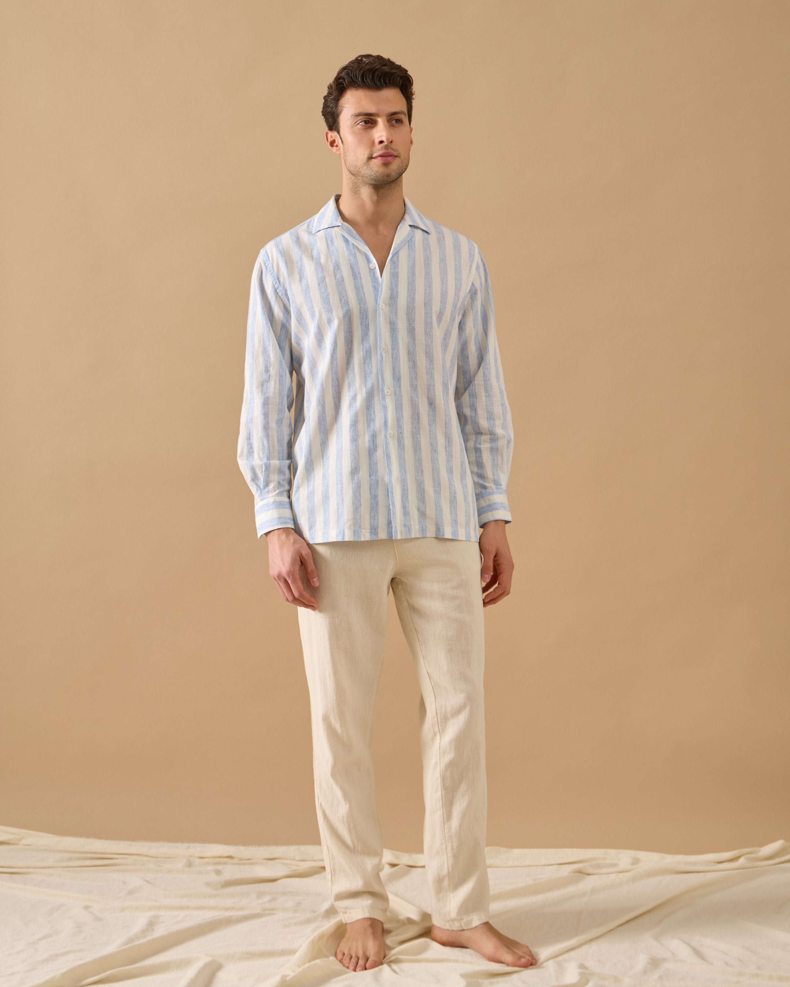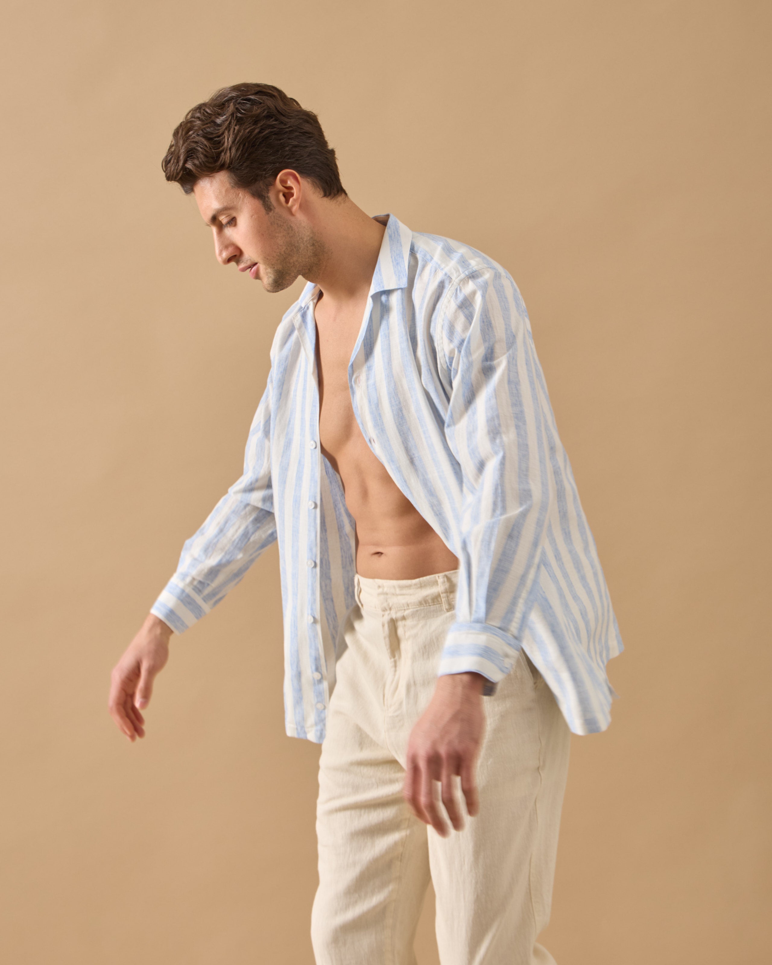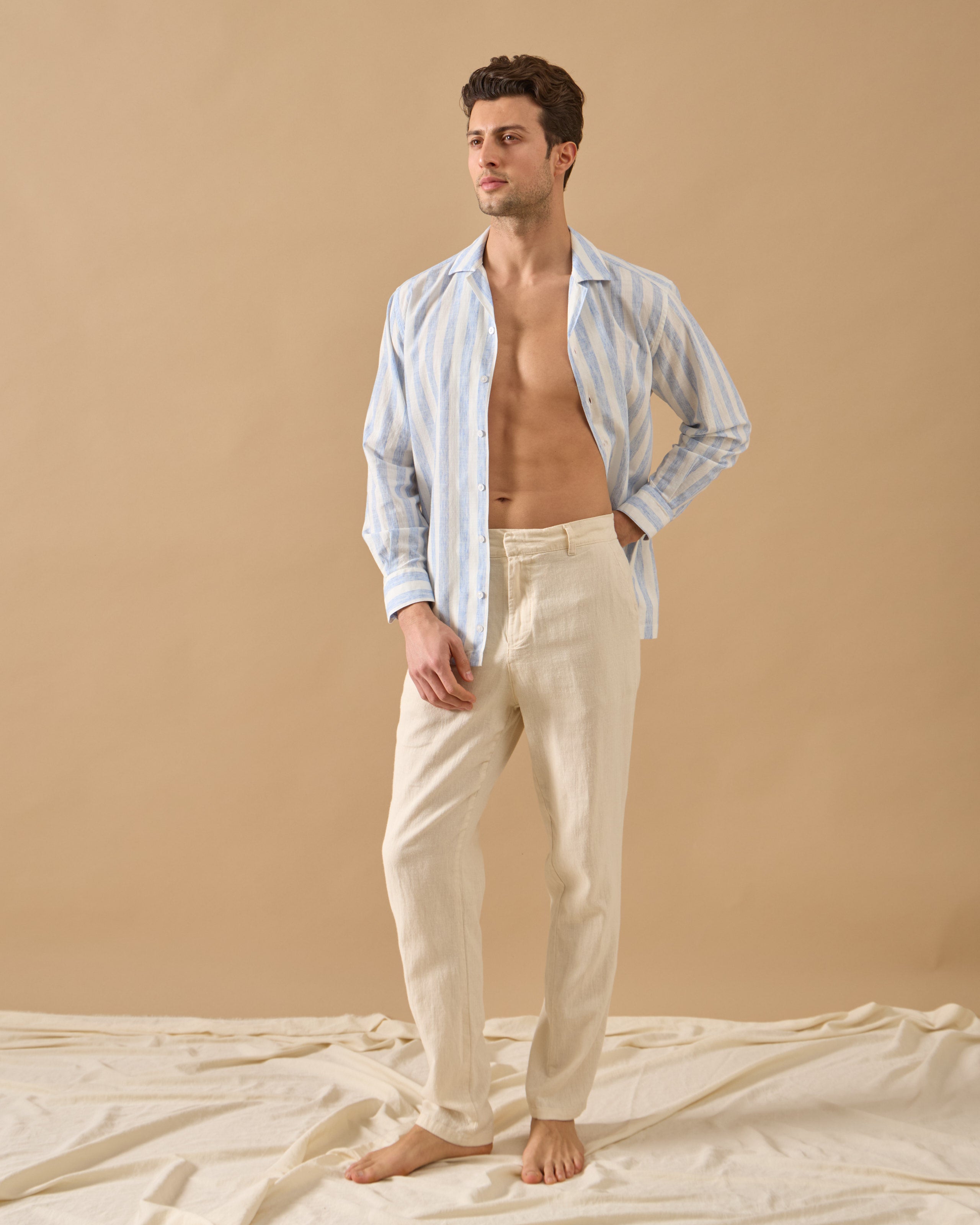 - Cămașă din in cu dungi naturale, lejeră și respirabilă.