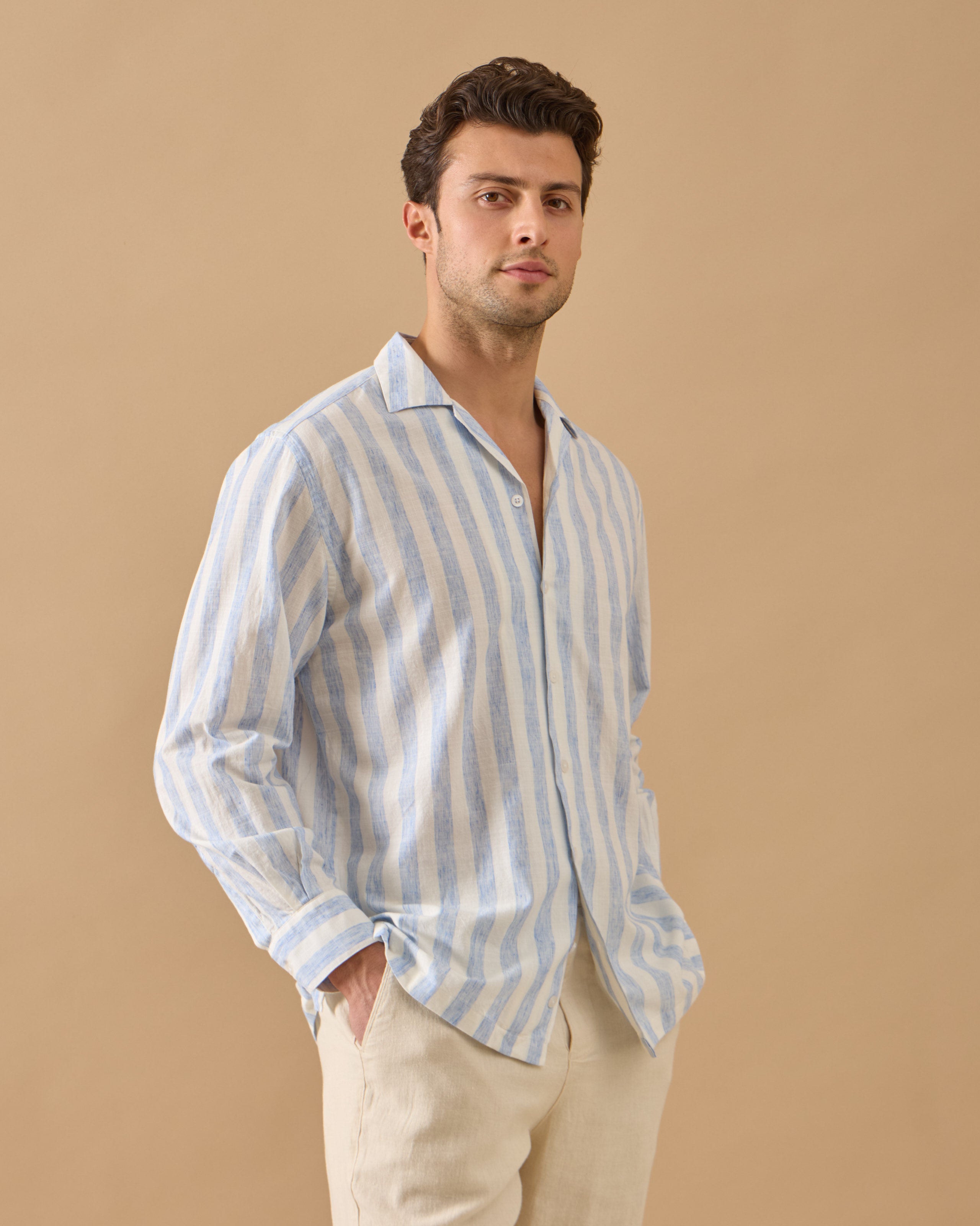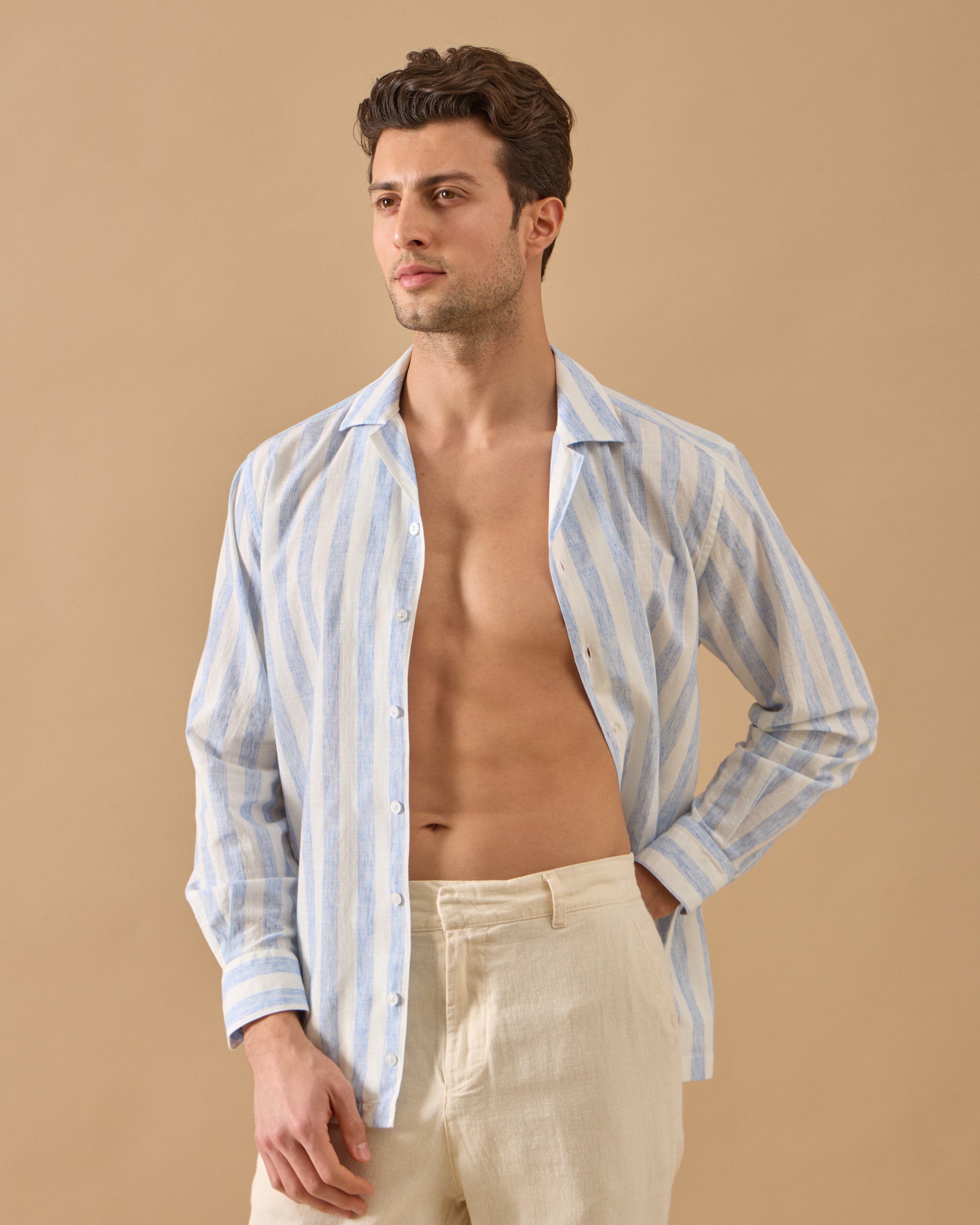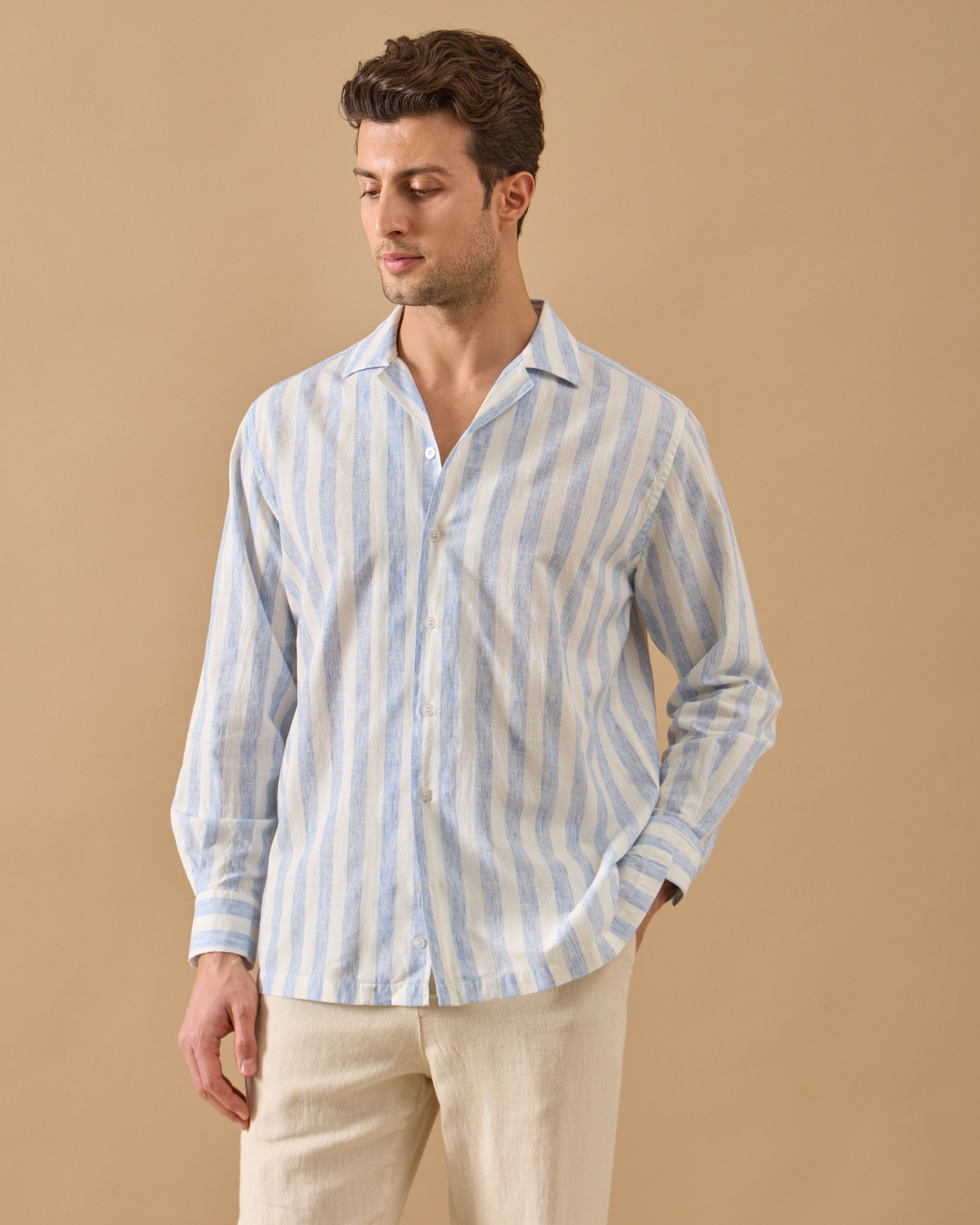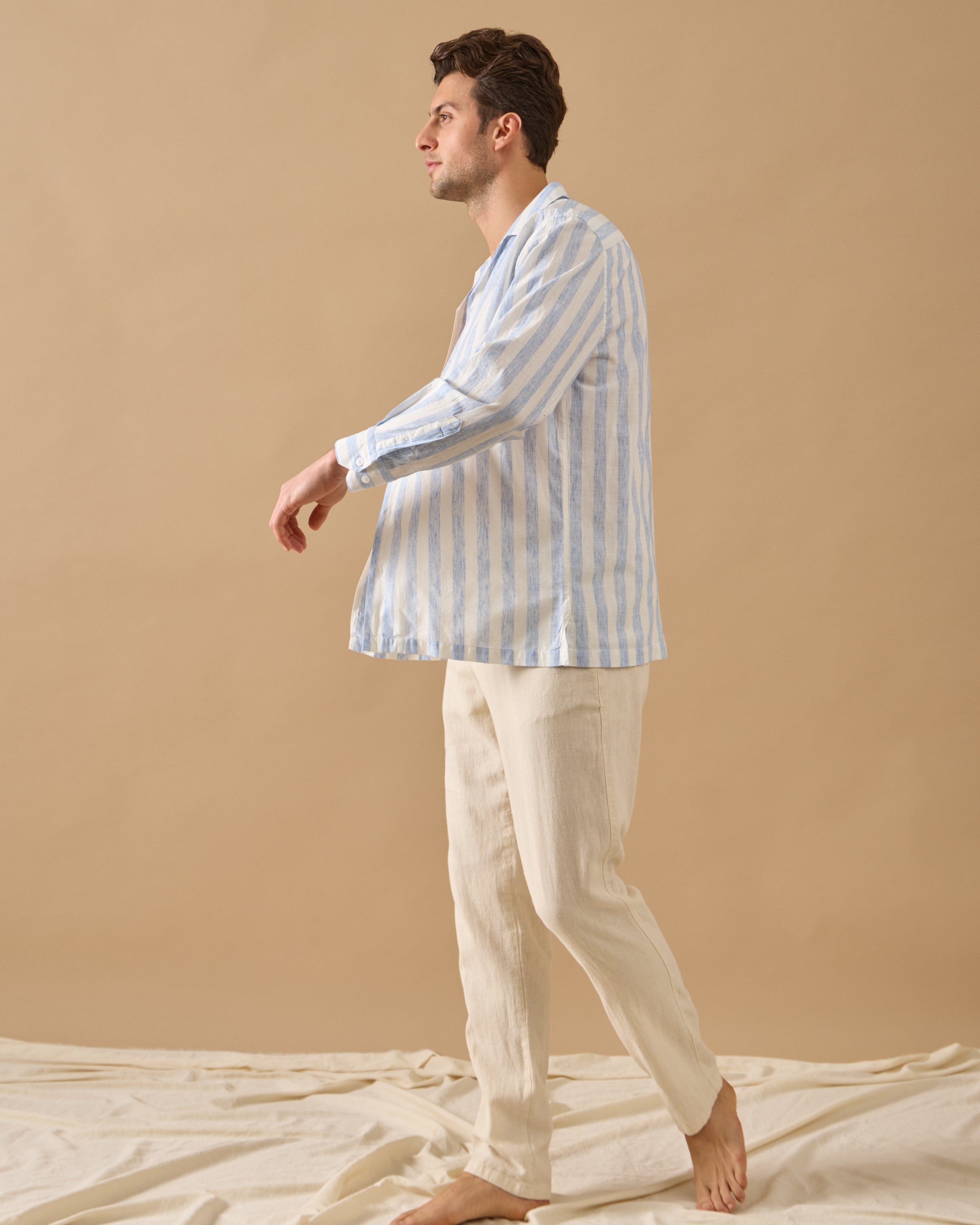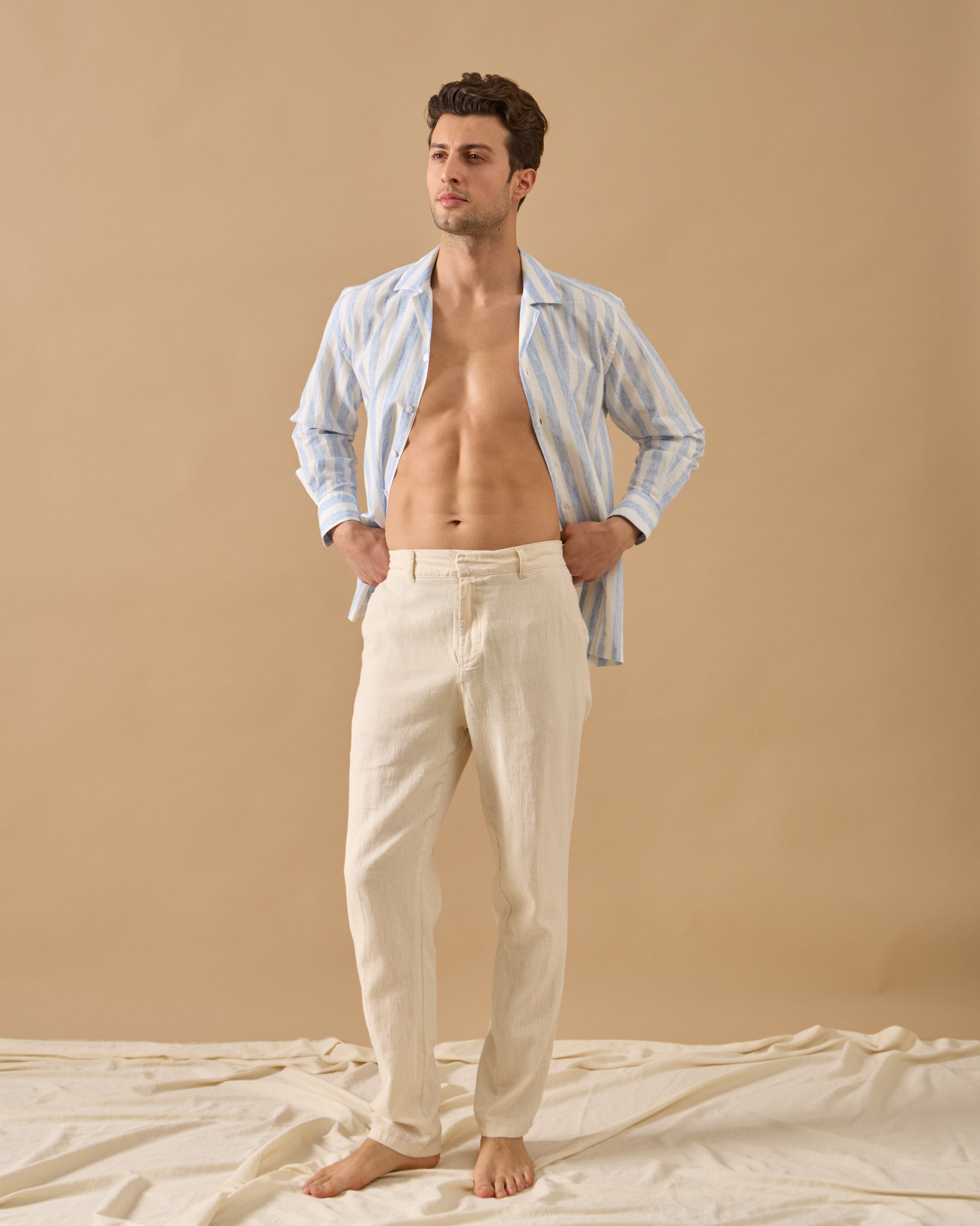 - Cămașă din in cu dungi naturale, lejeră și respirabilă.