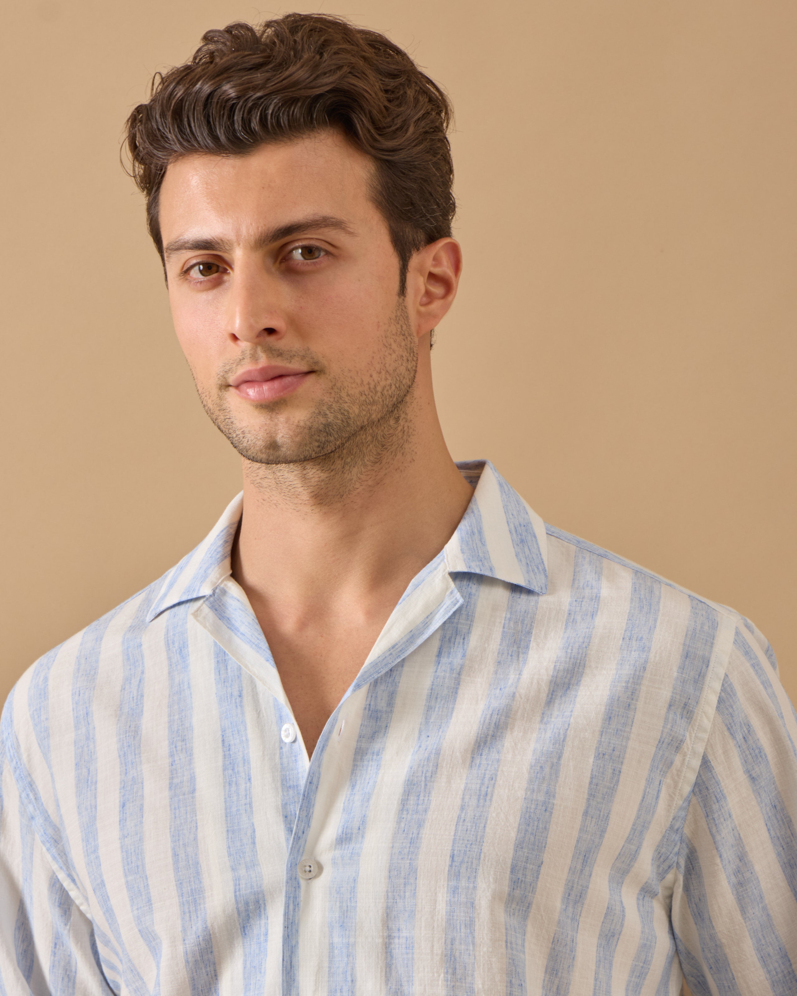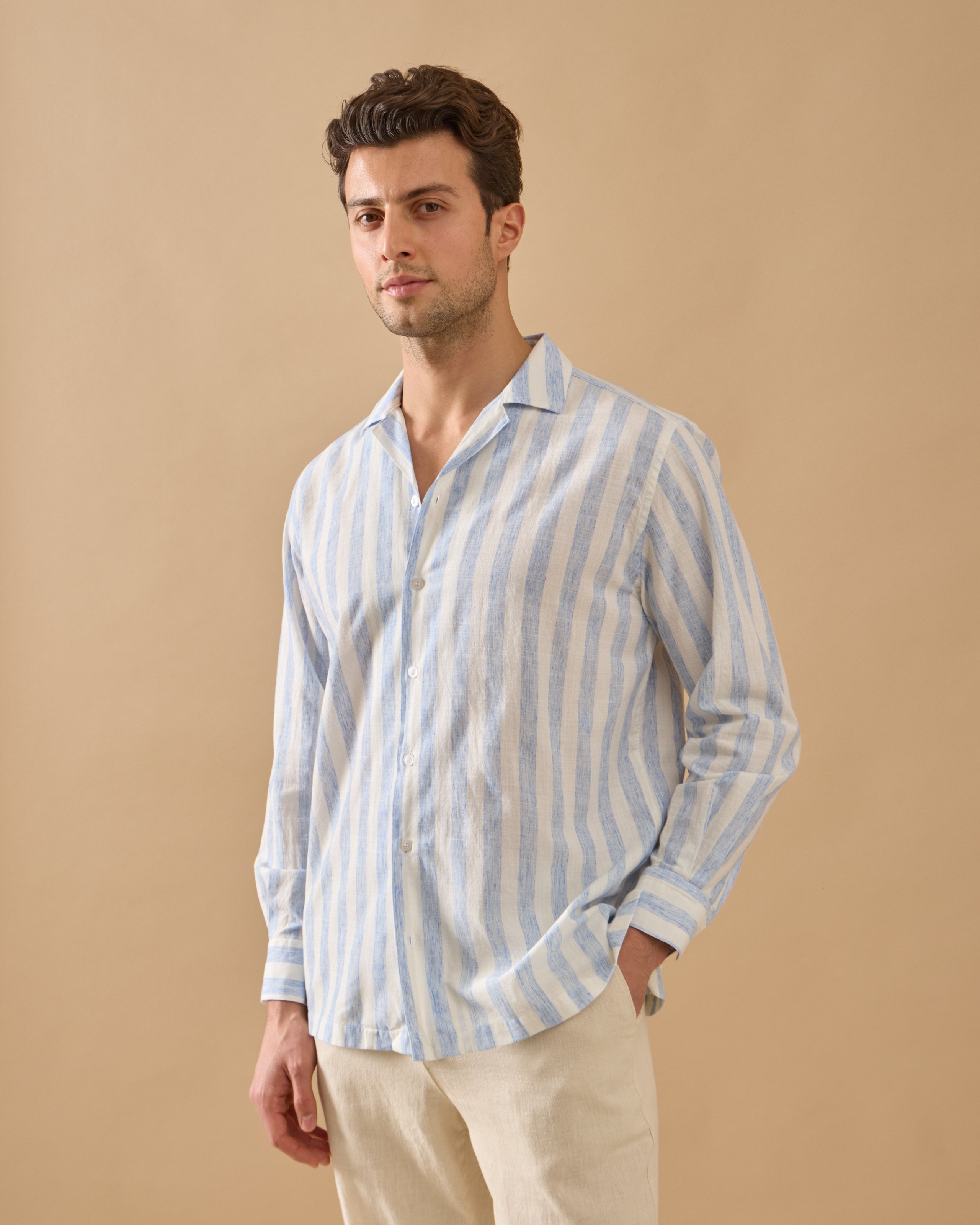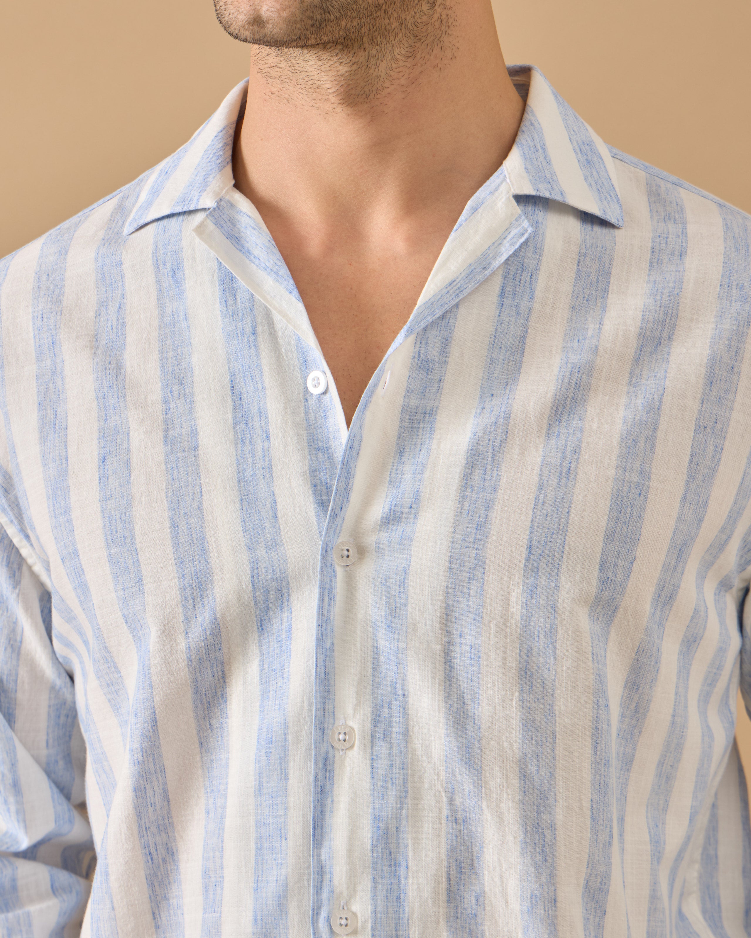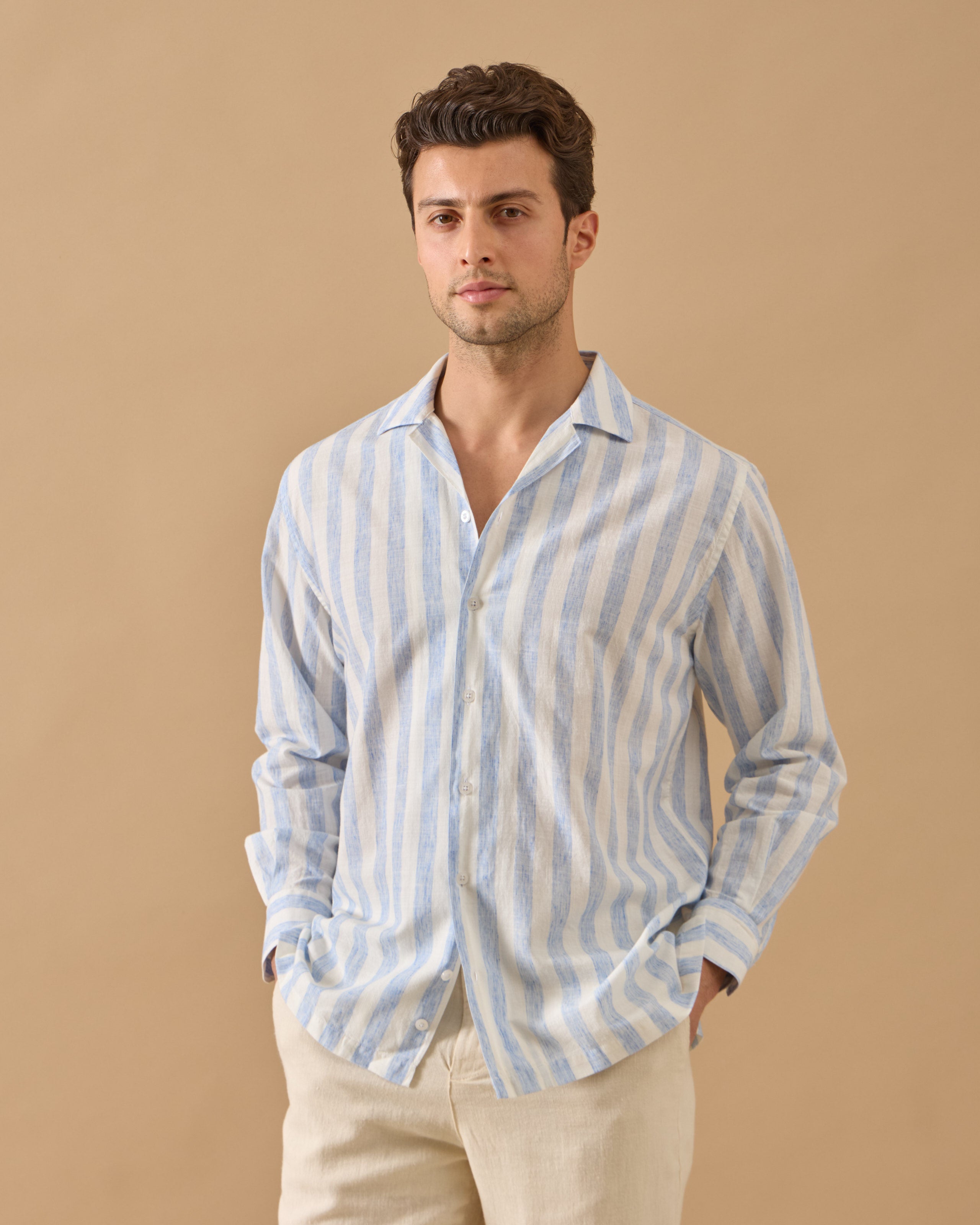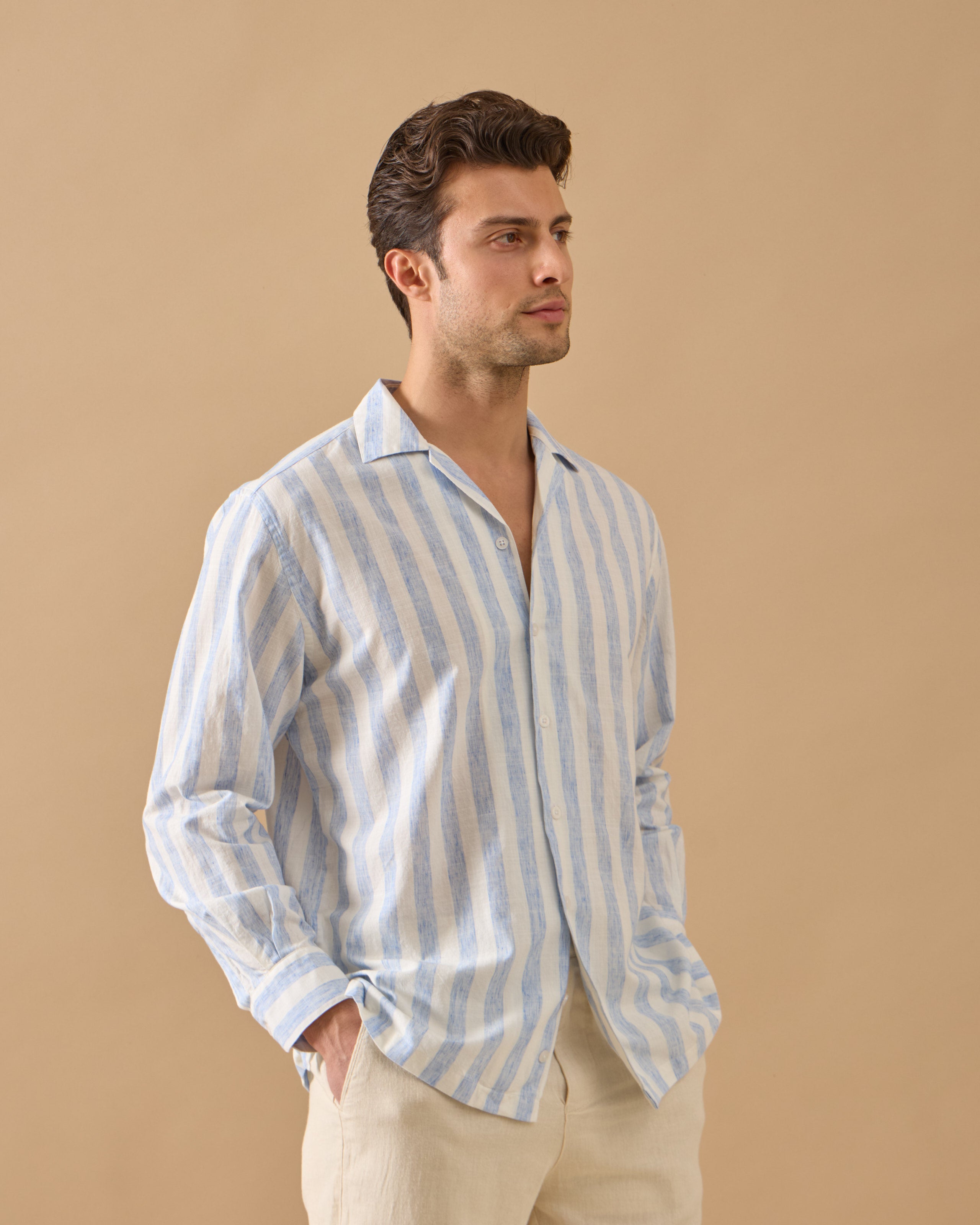 - Cămașă din in cu dungi naturale, lejeră și respirabilă.
