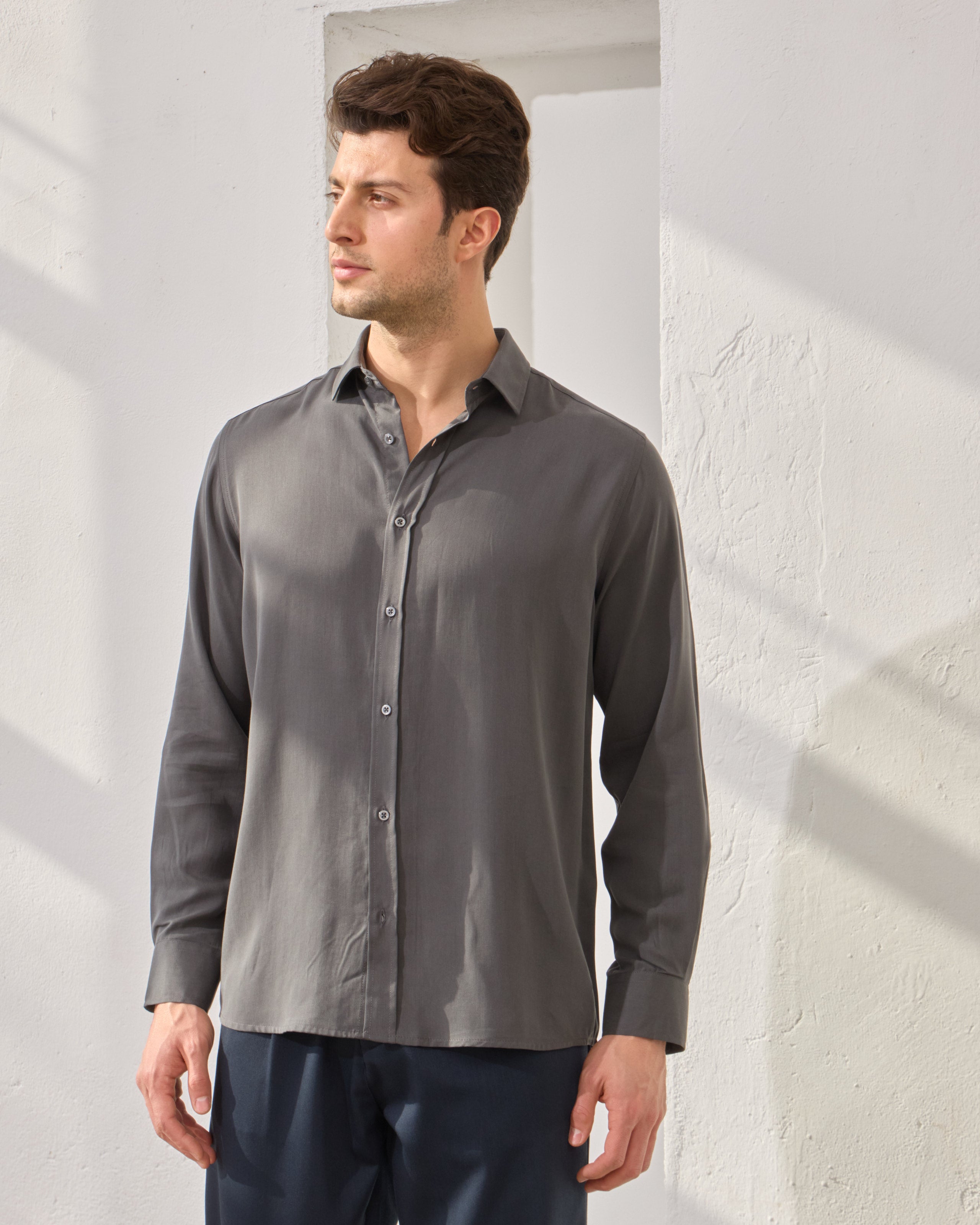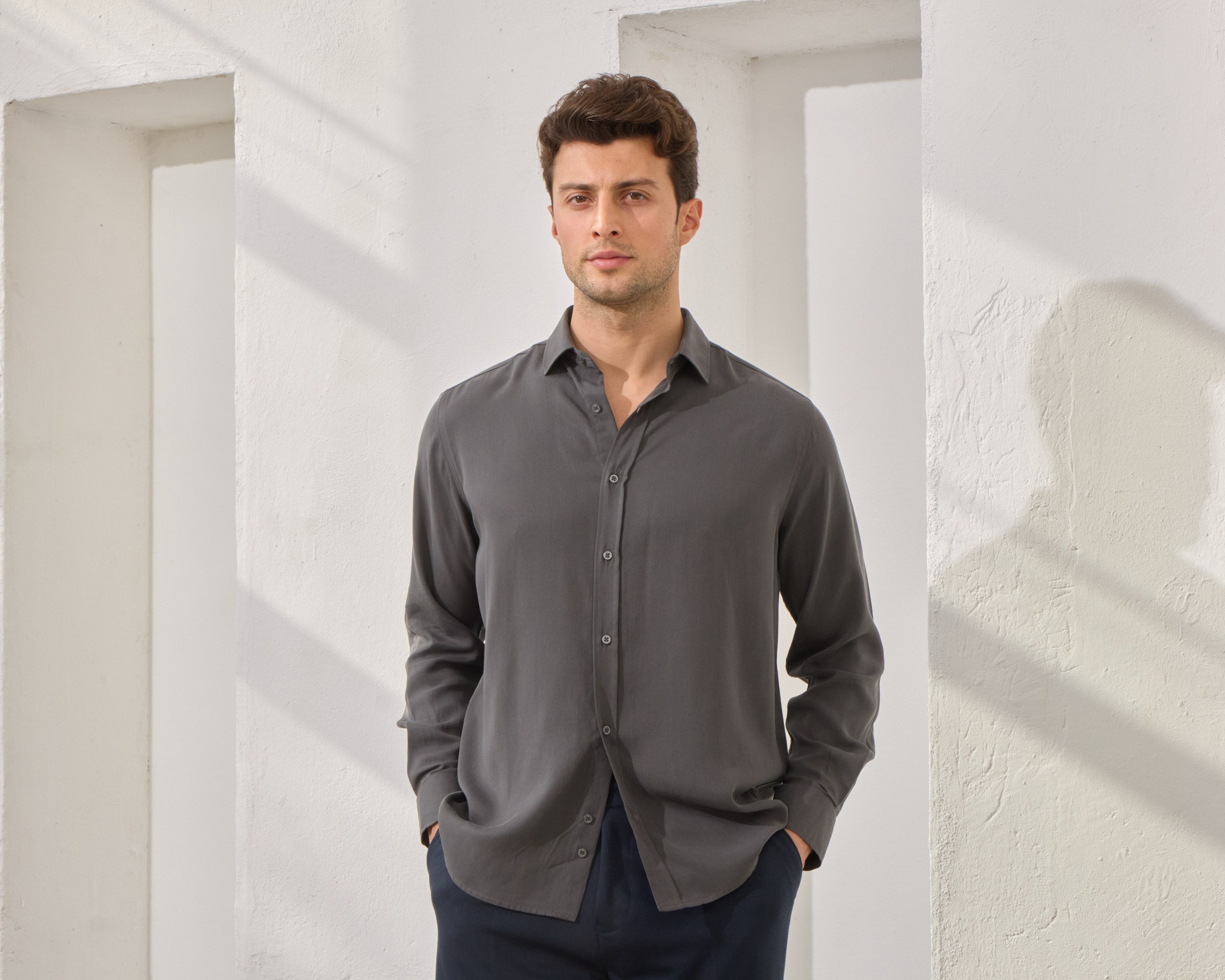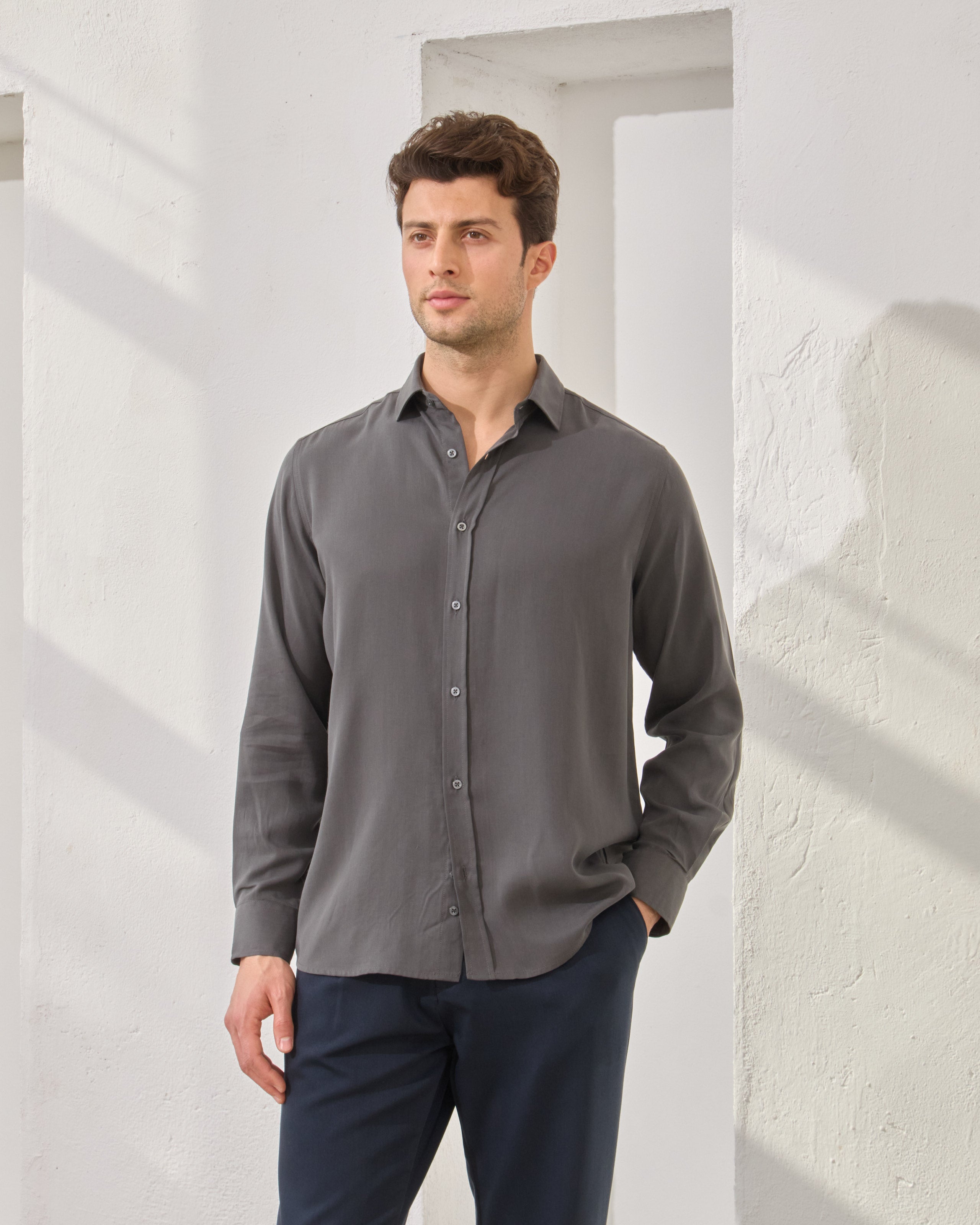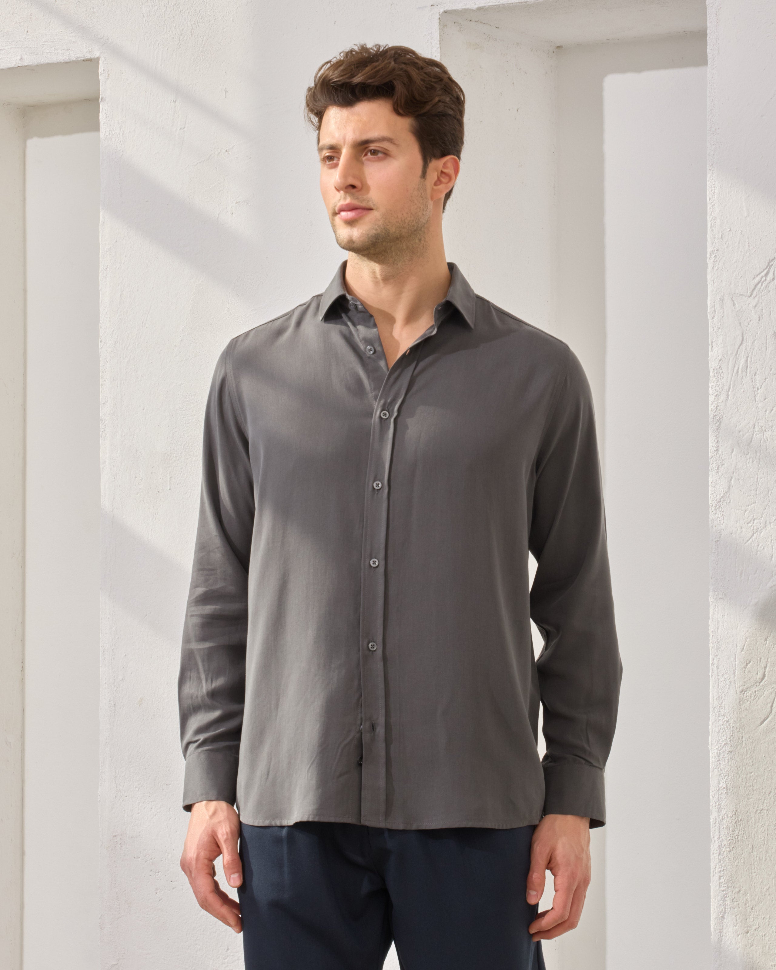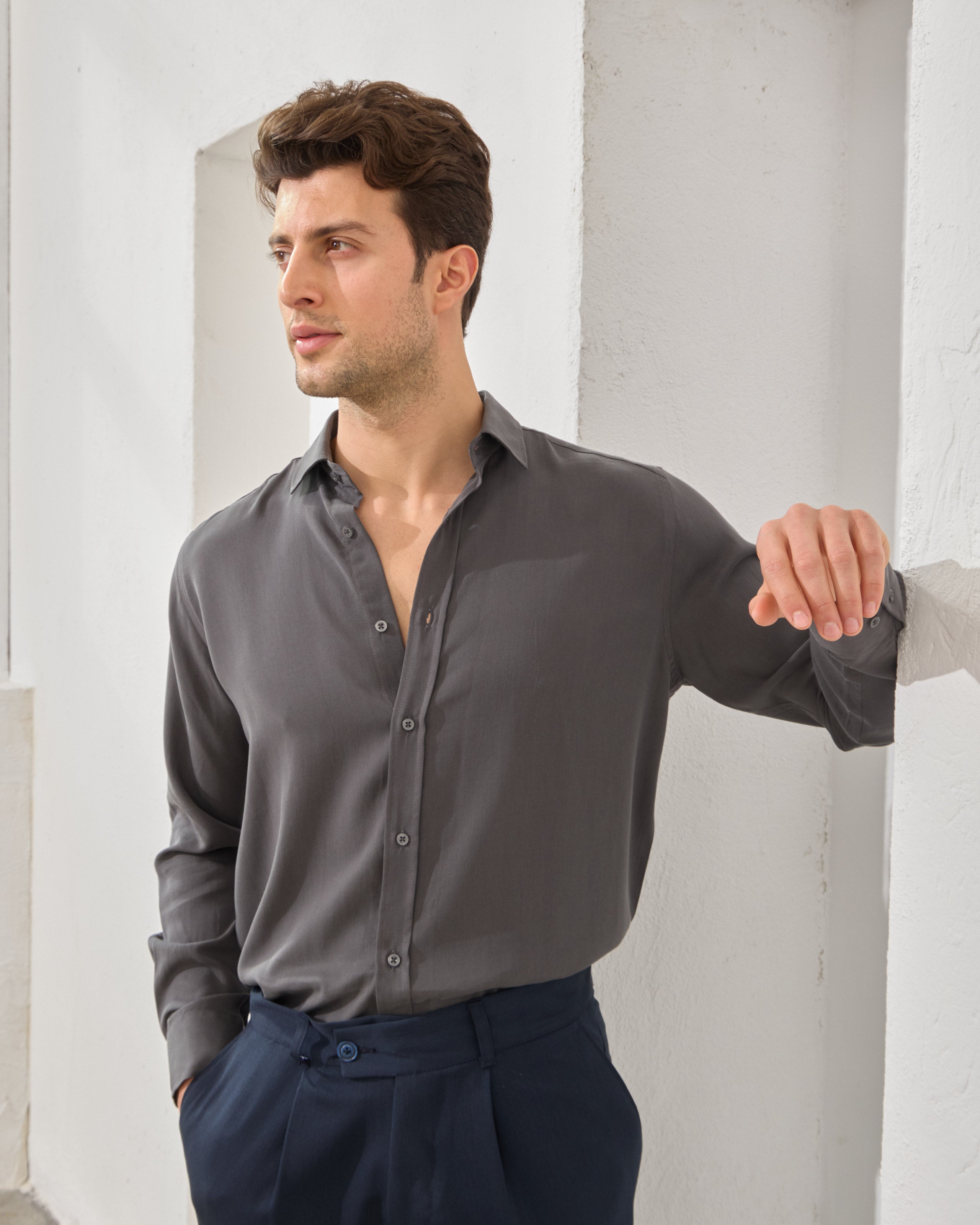 - Cămașă lejeră din viscoză moale, cu textură fină și cădere fluidă.