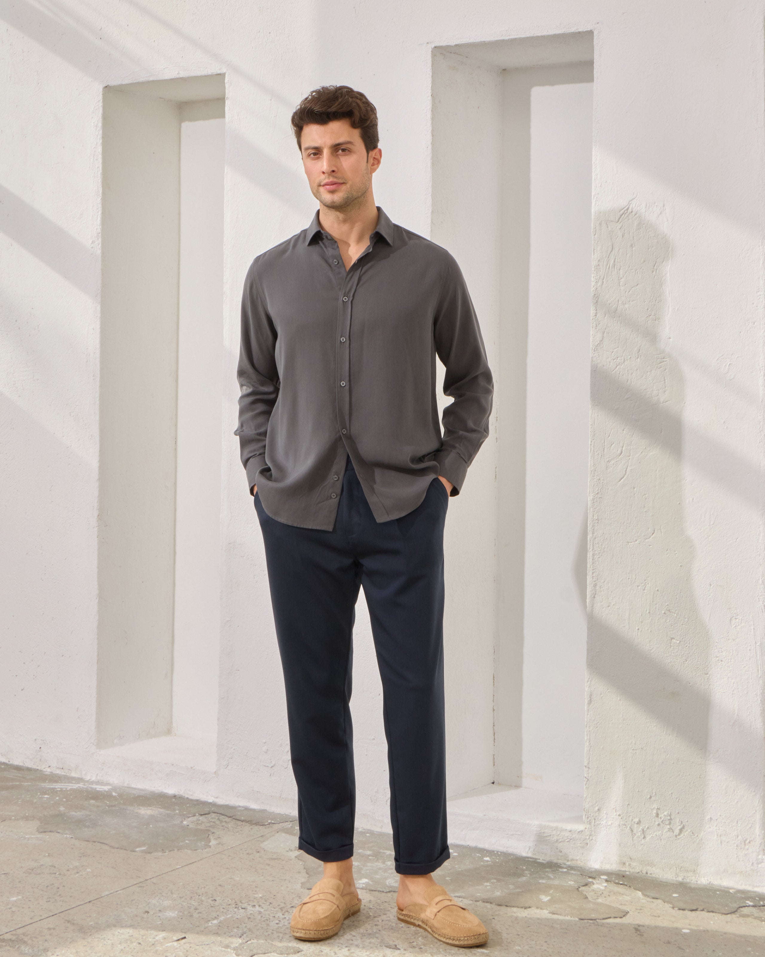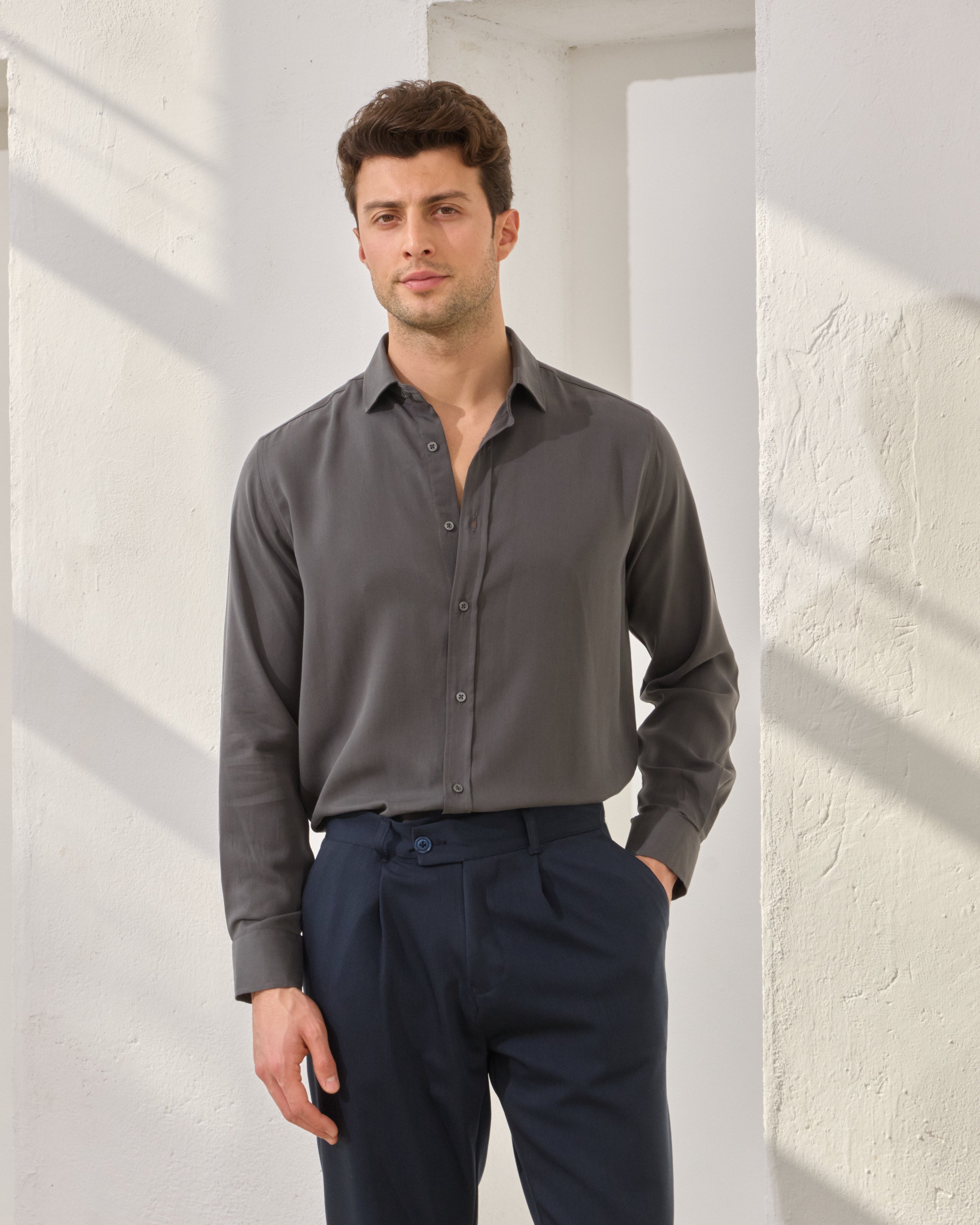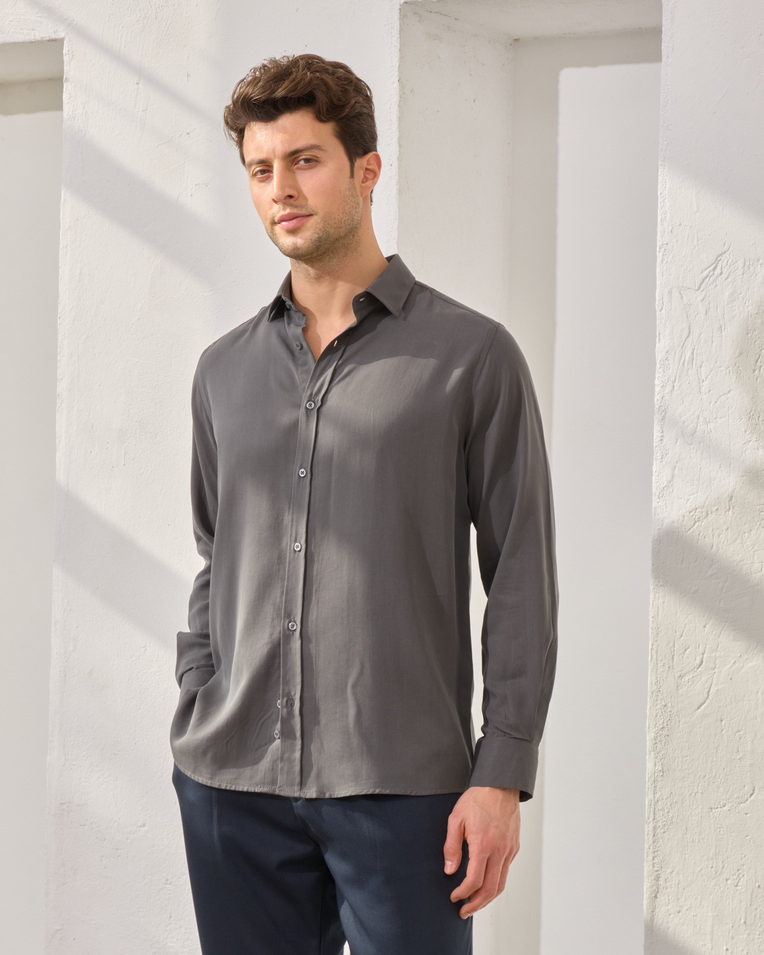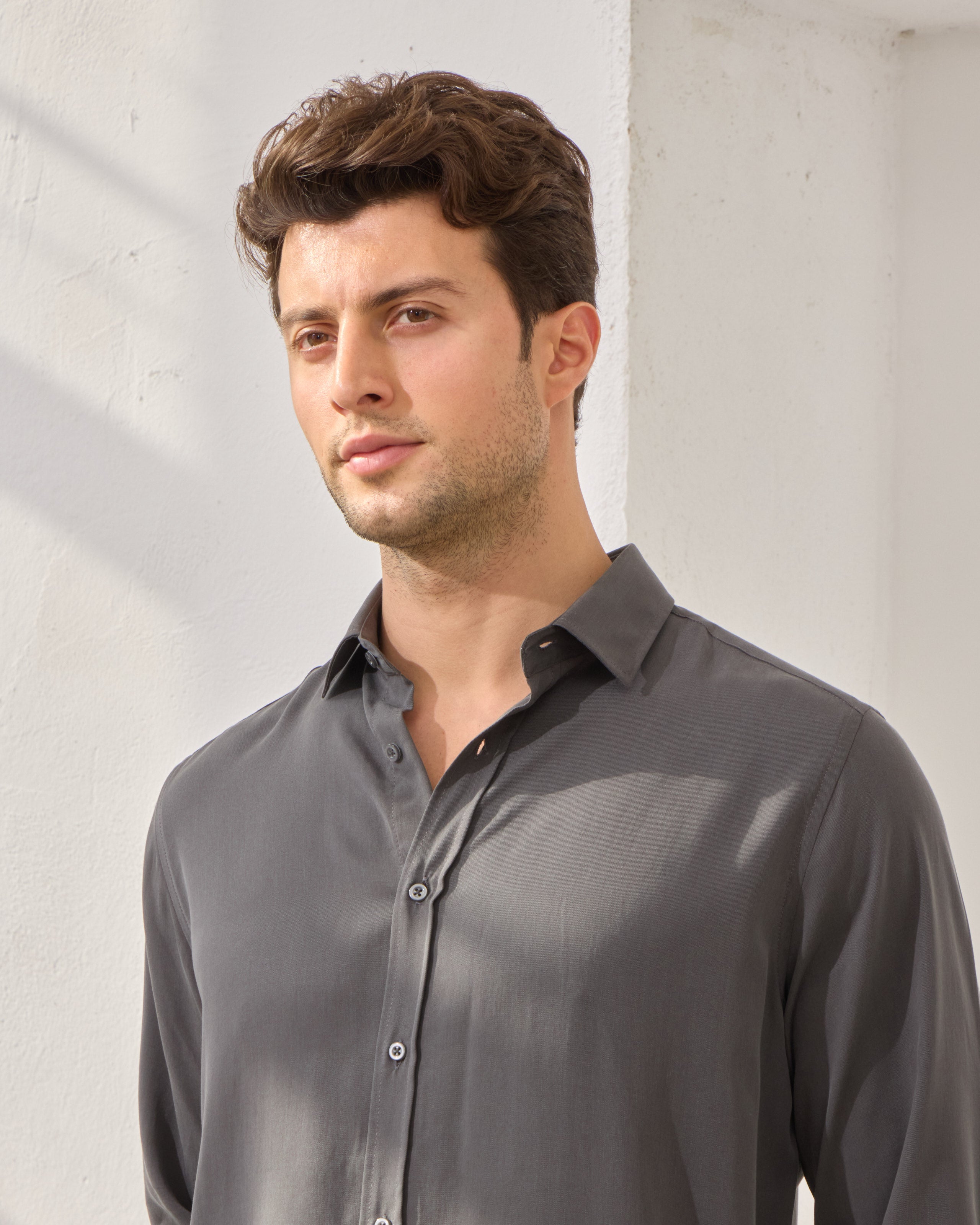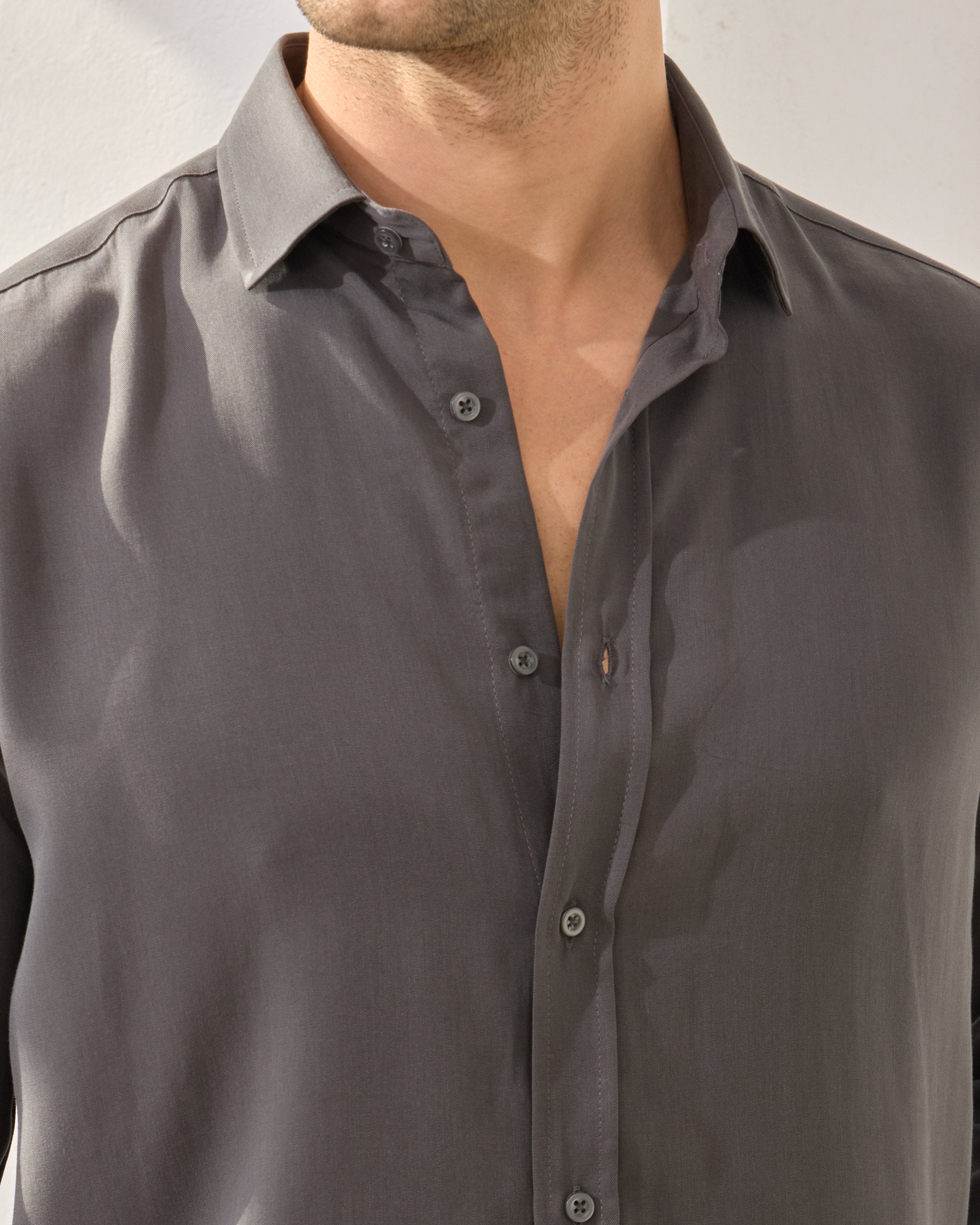 - Cămașă lejeră din viscoză moale, cu textură fină și cădere fluidă.