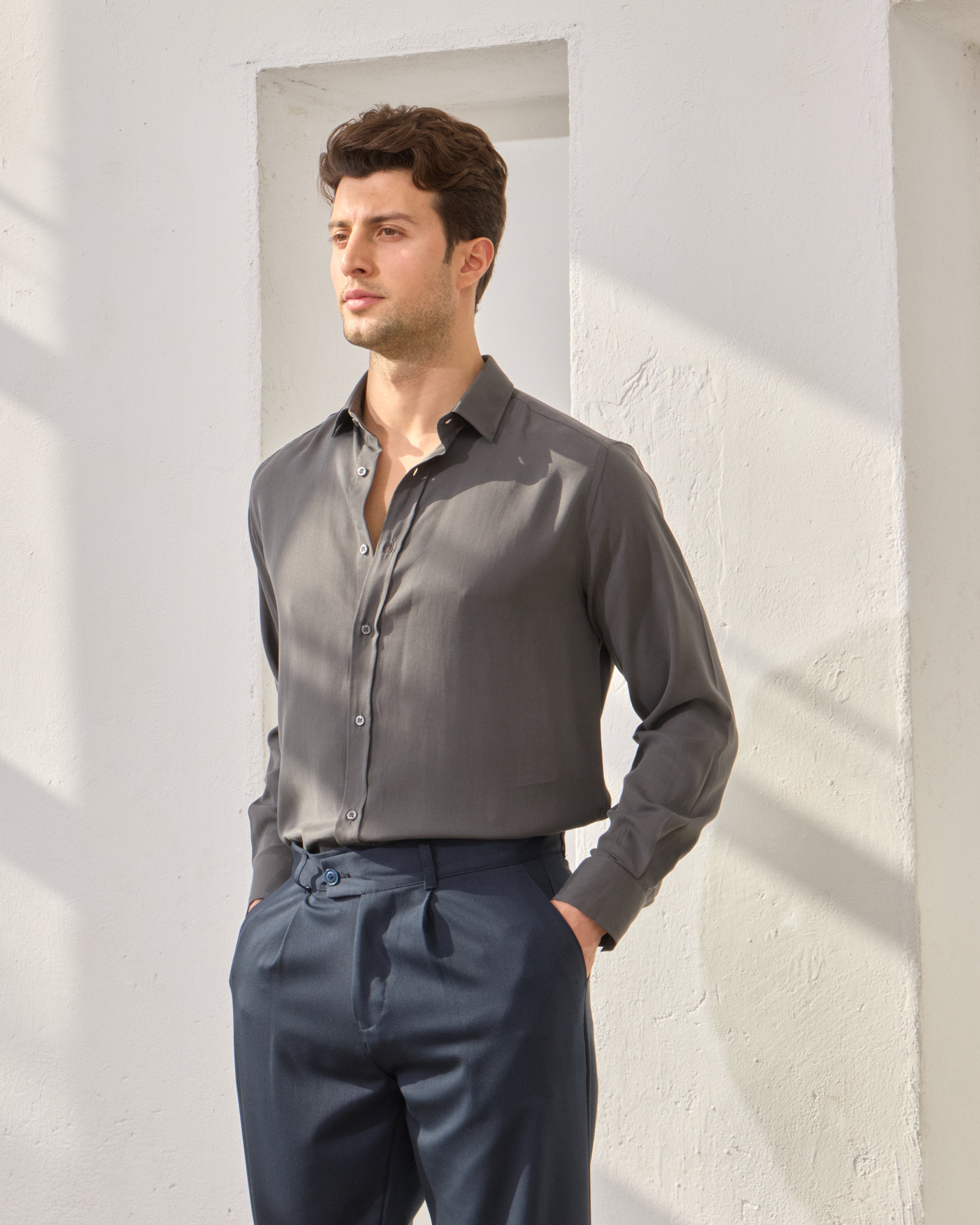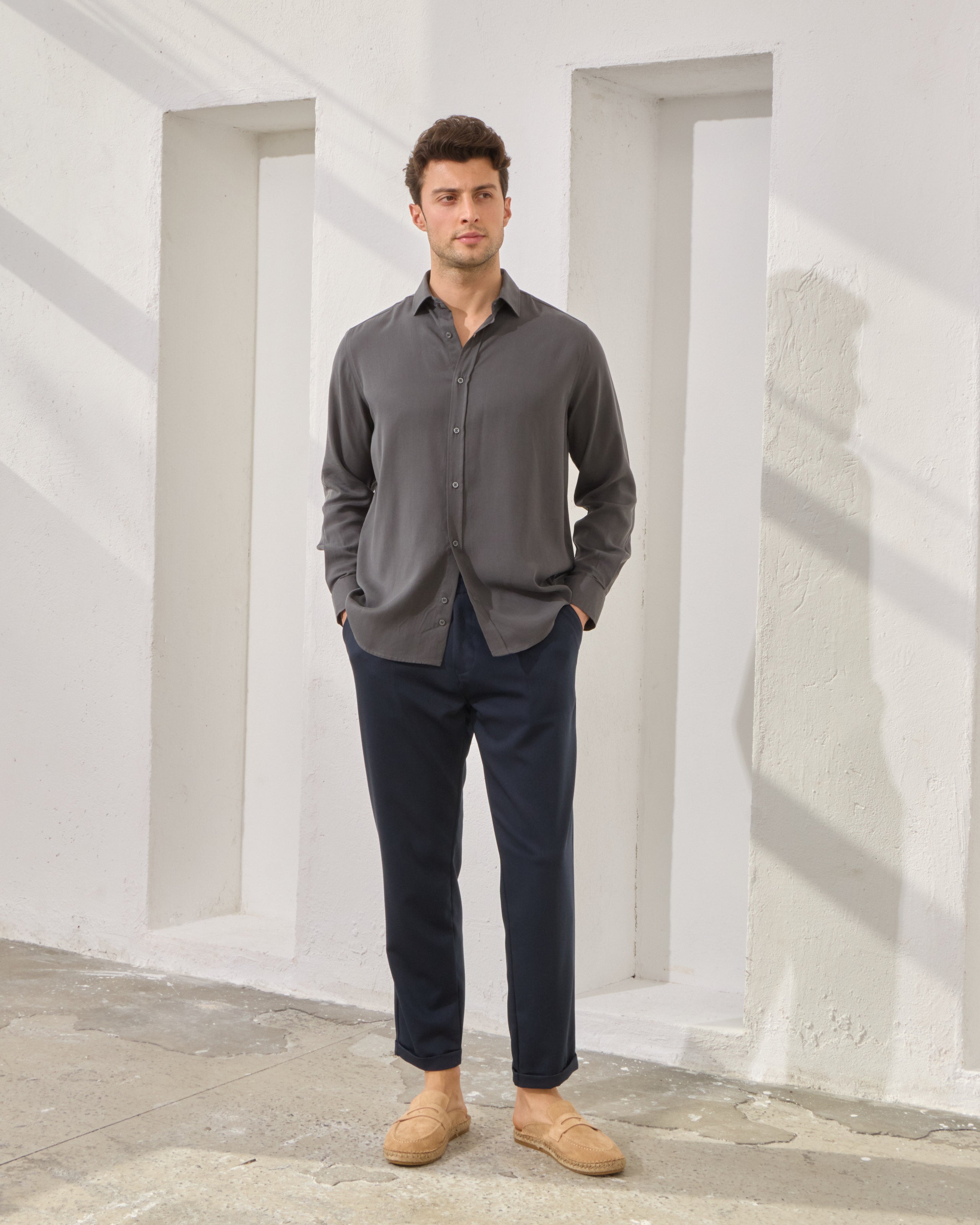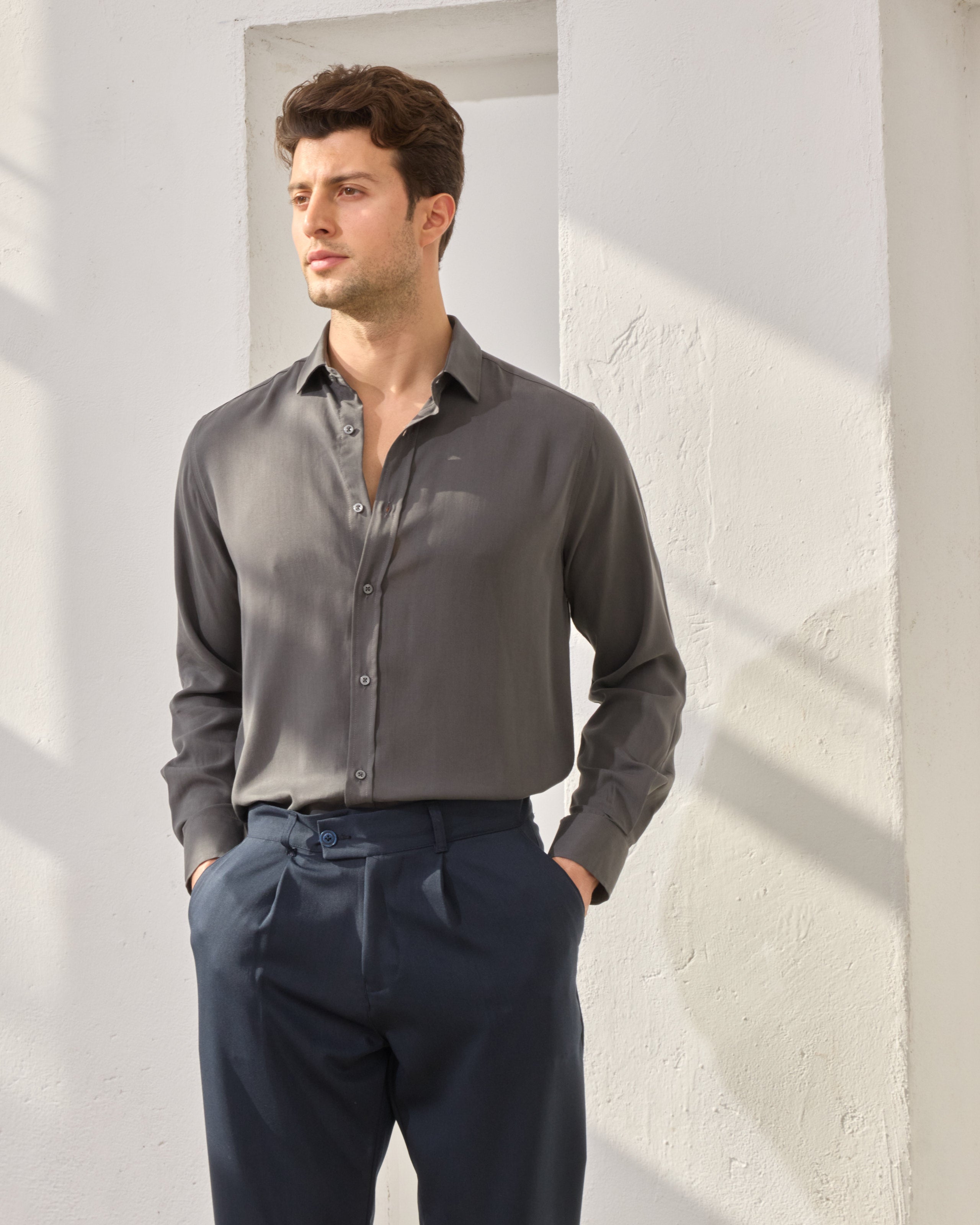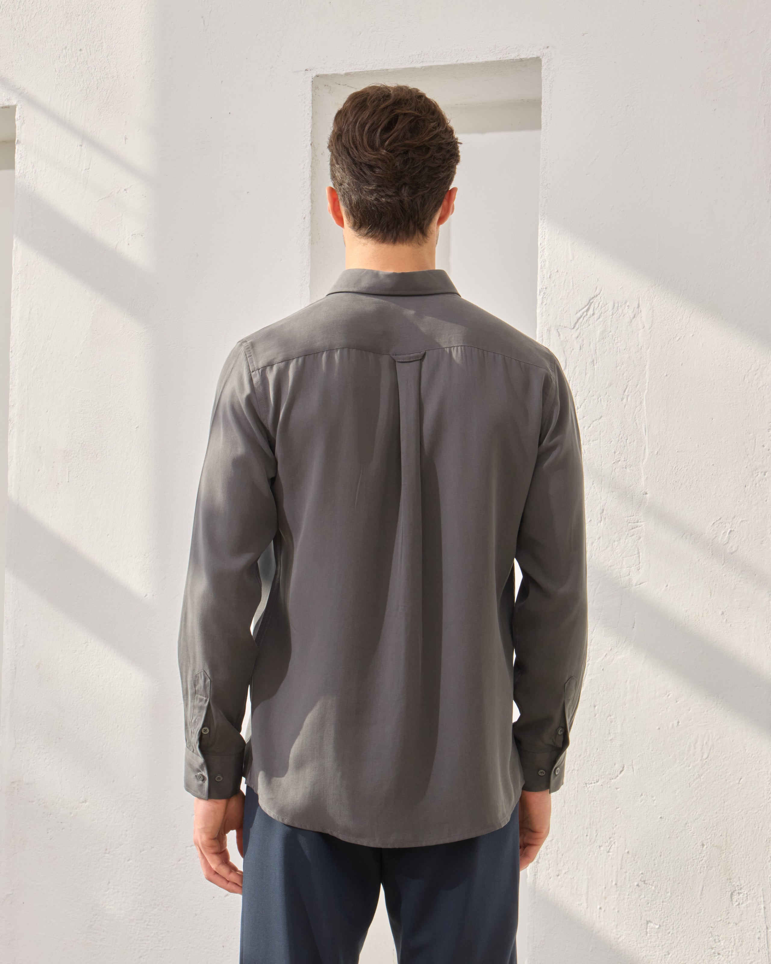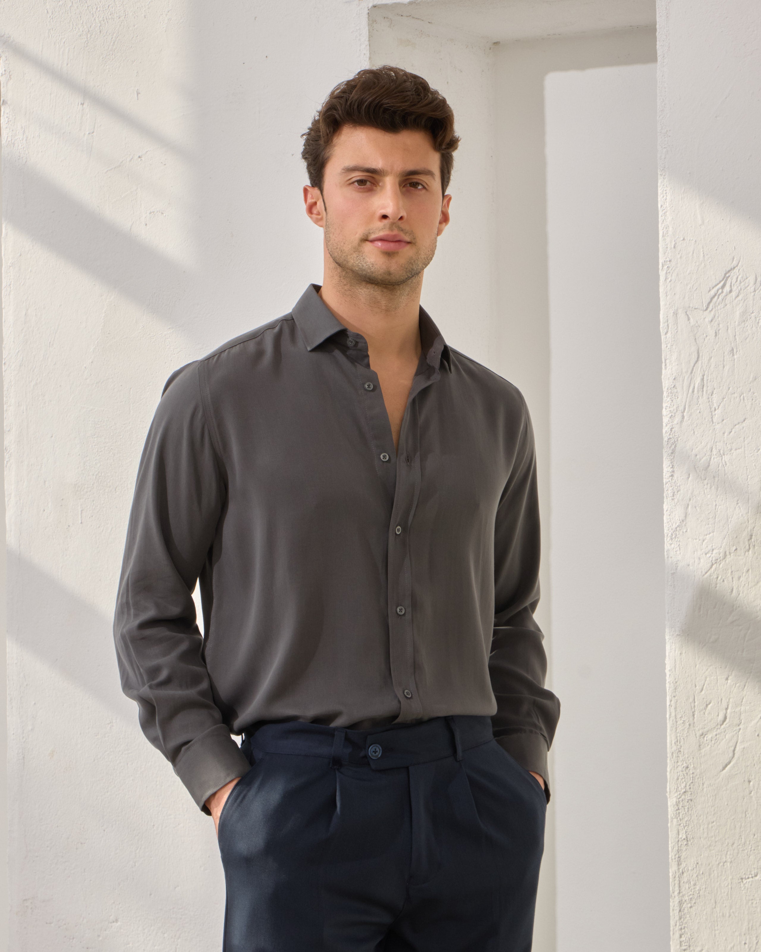 - Cămașă lejeră din viscoză moale, cu textură fină și cădere fluidă.