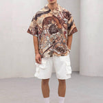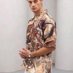 Piesa-statement a verii: cămașa oversize cu guler cubanez și imprimeu artistic în tonuri pământii (maro, cărămiziu, bej) aduce vibe de galerie într-un format relaxat, perfect pentru zilele călduroase și city breaks.