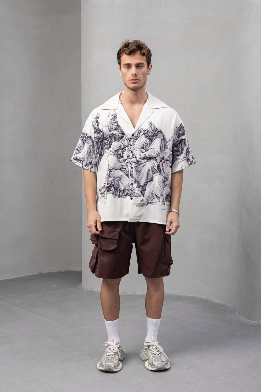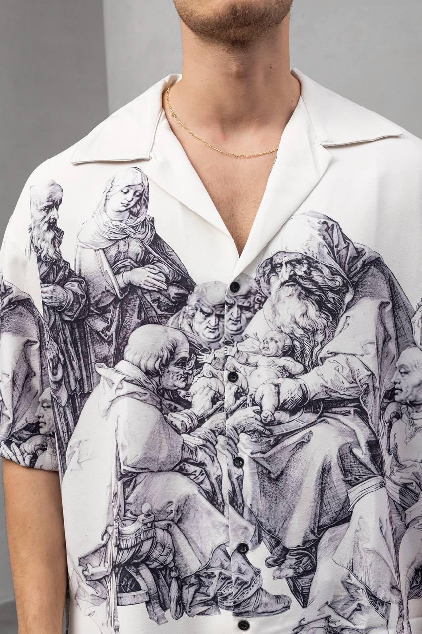 Clasică și cool în același timp, cămașa oversize cu guler cubanez aduce pe stofă o scenă în stil gravură renascentistă, în contrast alb-negru. Croiala relaxată și materialul fluid o fac piesa perfectă pentru ținute de vară cu personalitate.