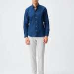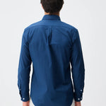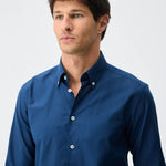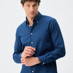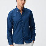 O Oxford clasică într-un bleumarin intens: suficient de curată pentru birou, suficient de relaxată pentru weekend. Țesătura are acea textură specifică Oxford – ușor granulată, respirabilă și plăcută pe piele.