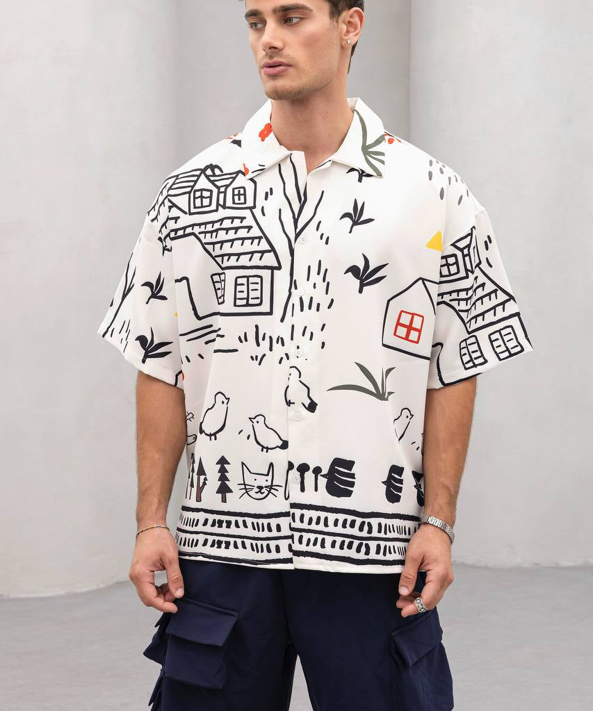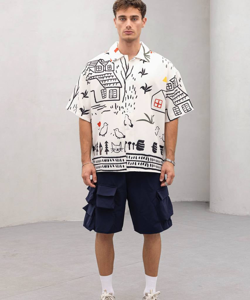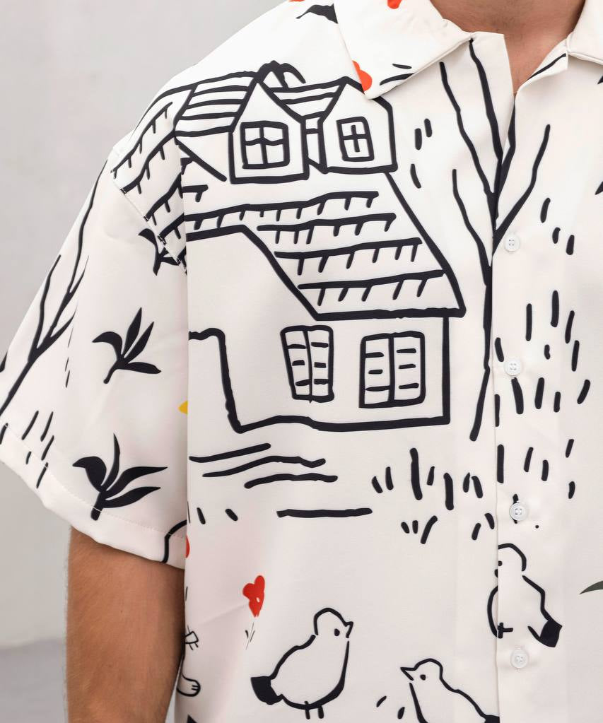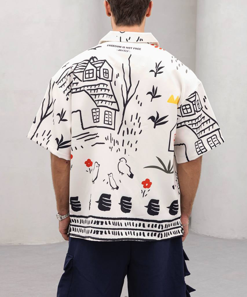 Cămașă oversize cu guler cubanez – „Village Sketch” (alb-ivoire)