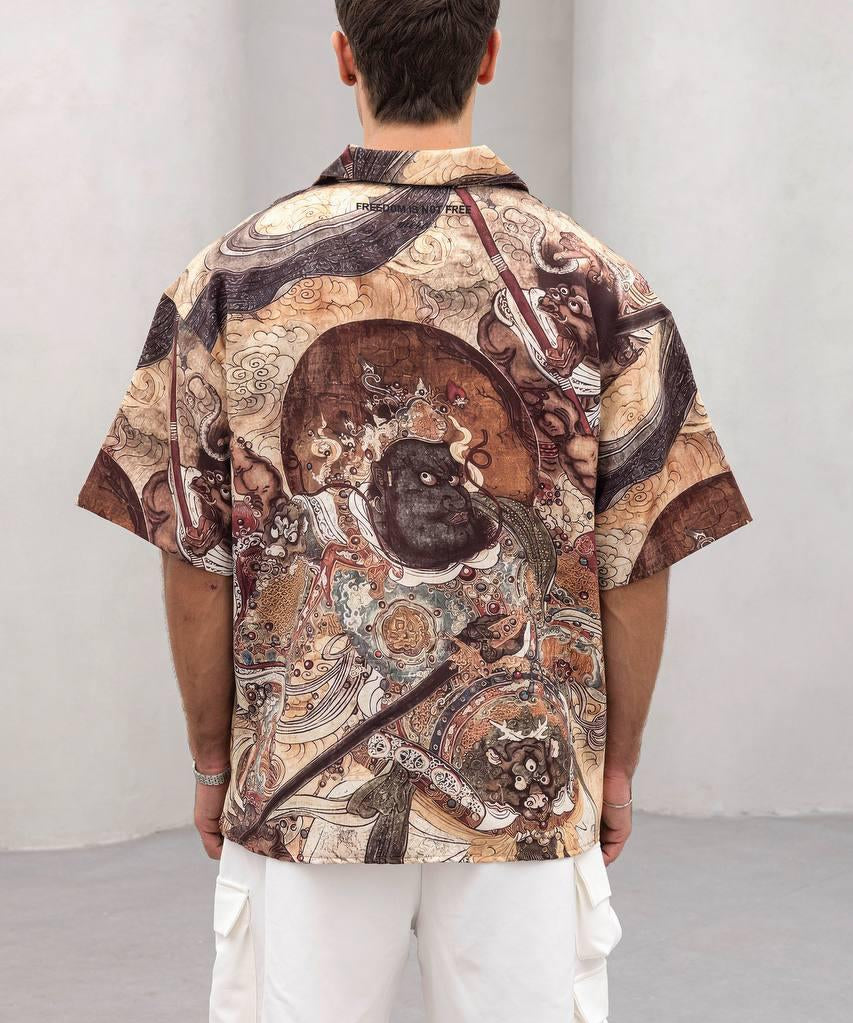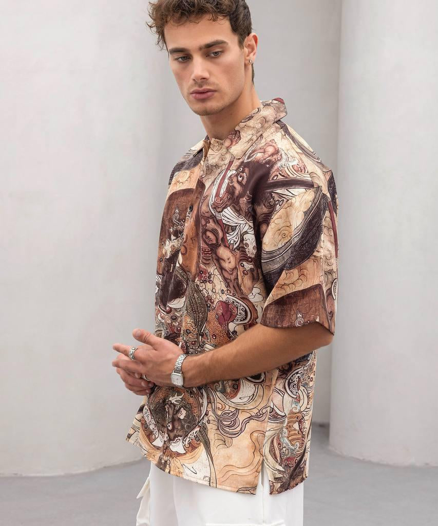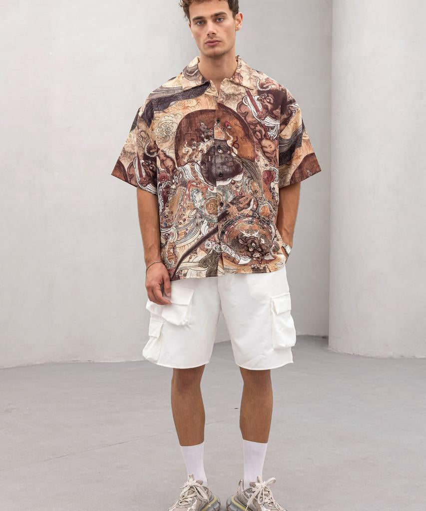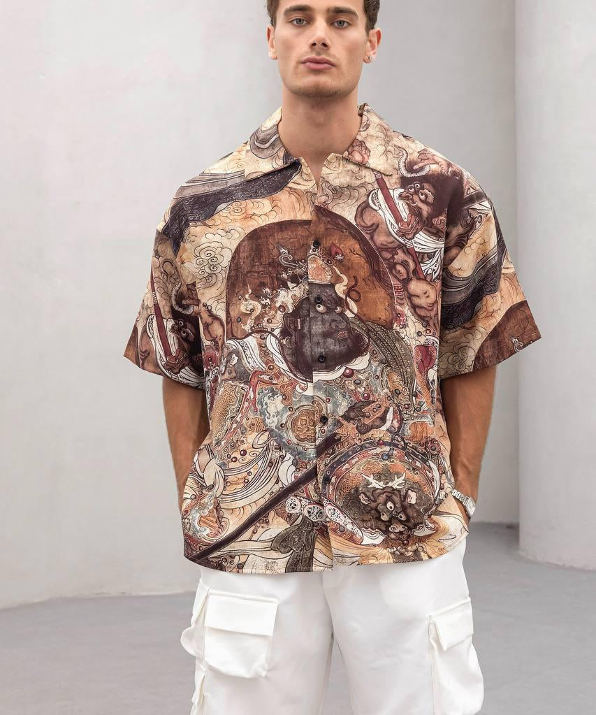 Cămașă oversize cu guler cubanez și imprimeu mural oriental