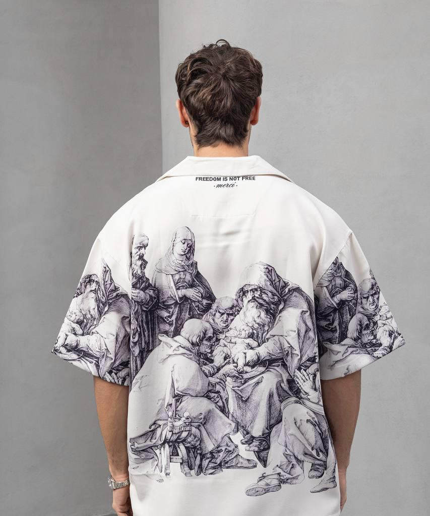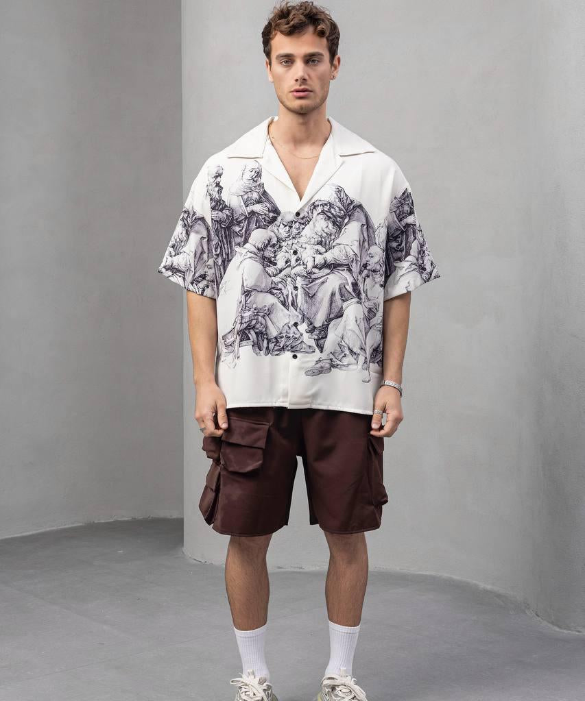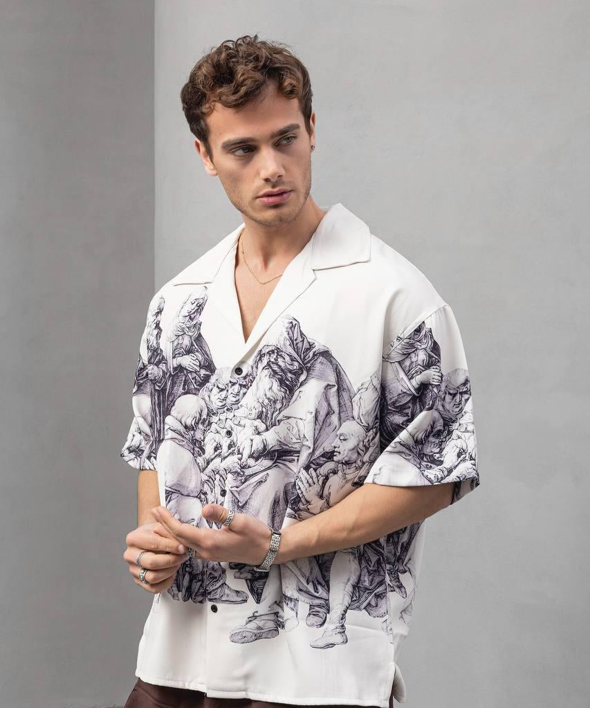 Cămașă oversize cu guler cubanez – Imprimeu „Gravură Renascentistă” (alb-negru)