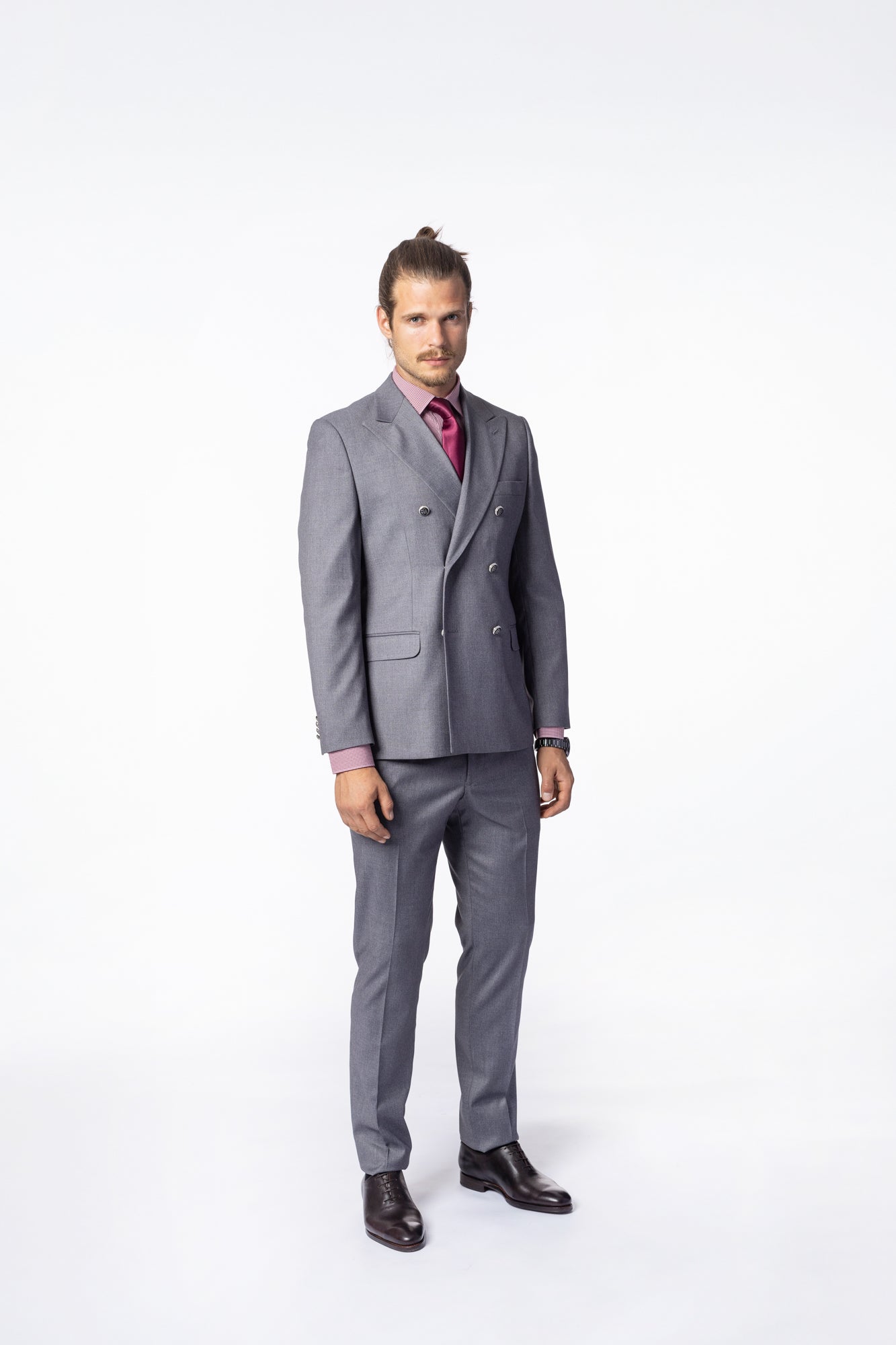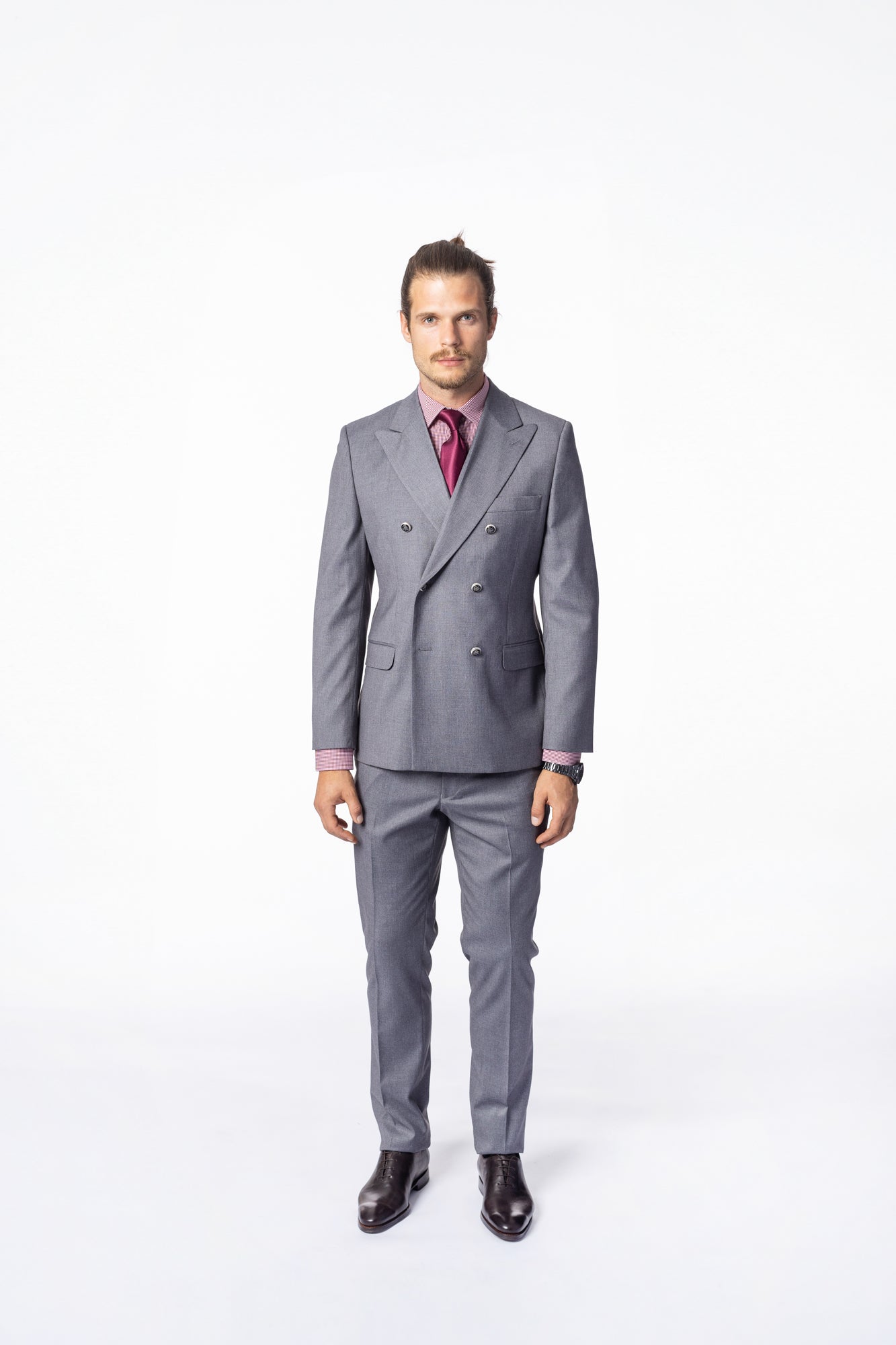 Acest costum elegant gri, cu o croială slim fit, este ideal pentru ocazii formale sau întâlniri de afaceri. Sacoul dublu petrecut și pantalonii cu talie normală, în timp ce detaliile atent lucrate oferă un plus de sofisticare. Materialul premium asigură un confort sporit și un aspect impecabil.