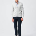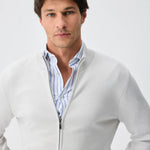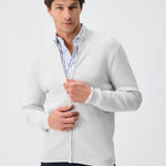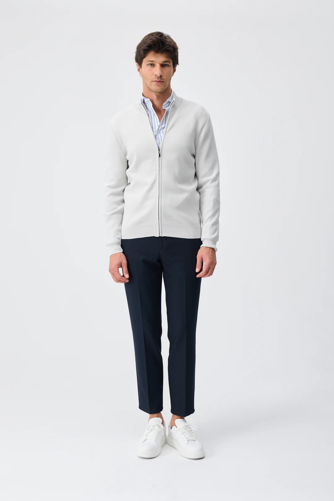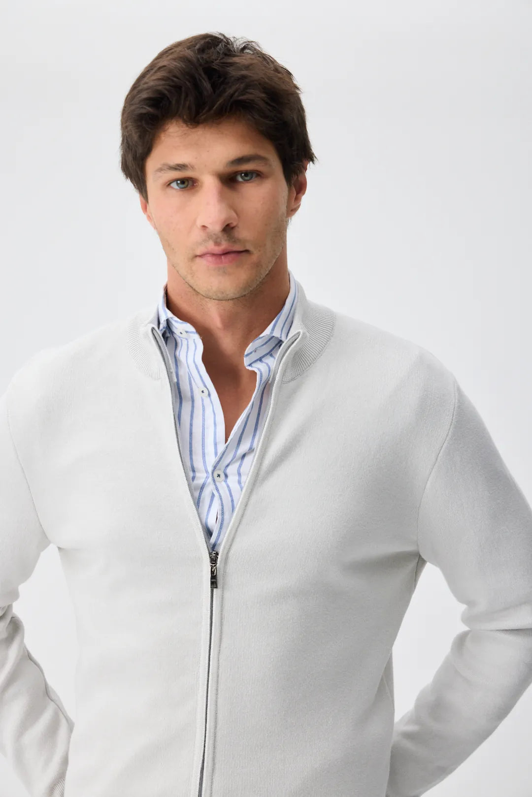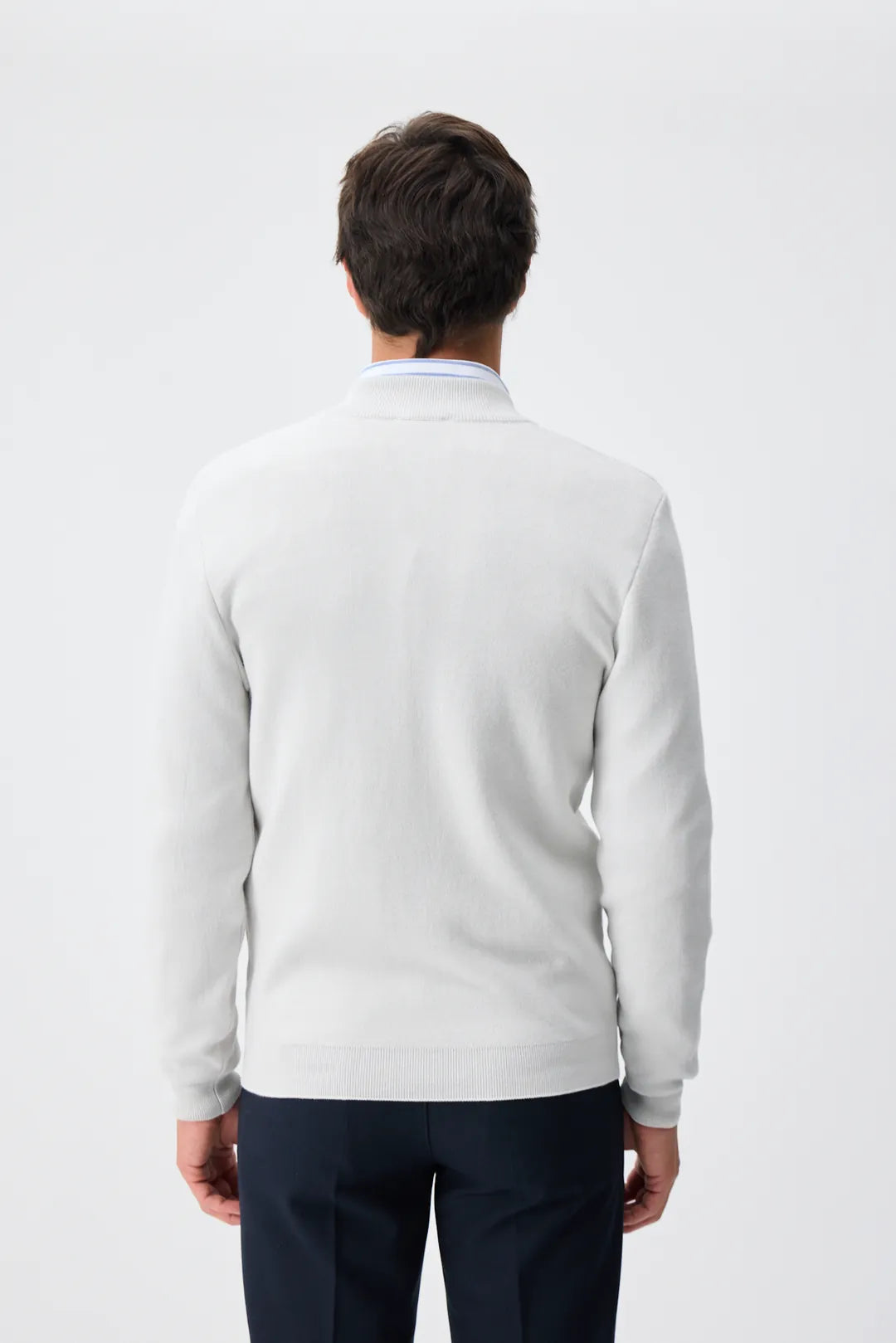 Pulover tricotat fin, cu guler tip mock-neck și fermoar pe toată lungimea. Din bumbac 100% pentru confort și respirabilitate, se poartă ușor peste cămașă sau tricou și funcționează excelent ca alternativă de jachetă în zilele răcoroase. Manșete și tiv rib pentru ținută curată, potrivită atât la birou, cât și în weekend.