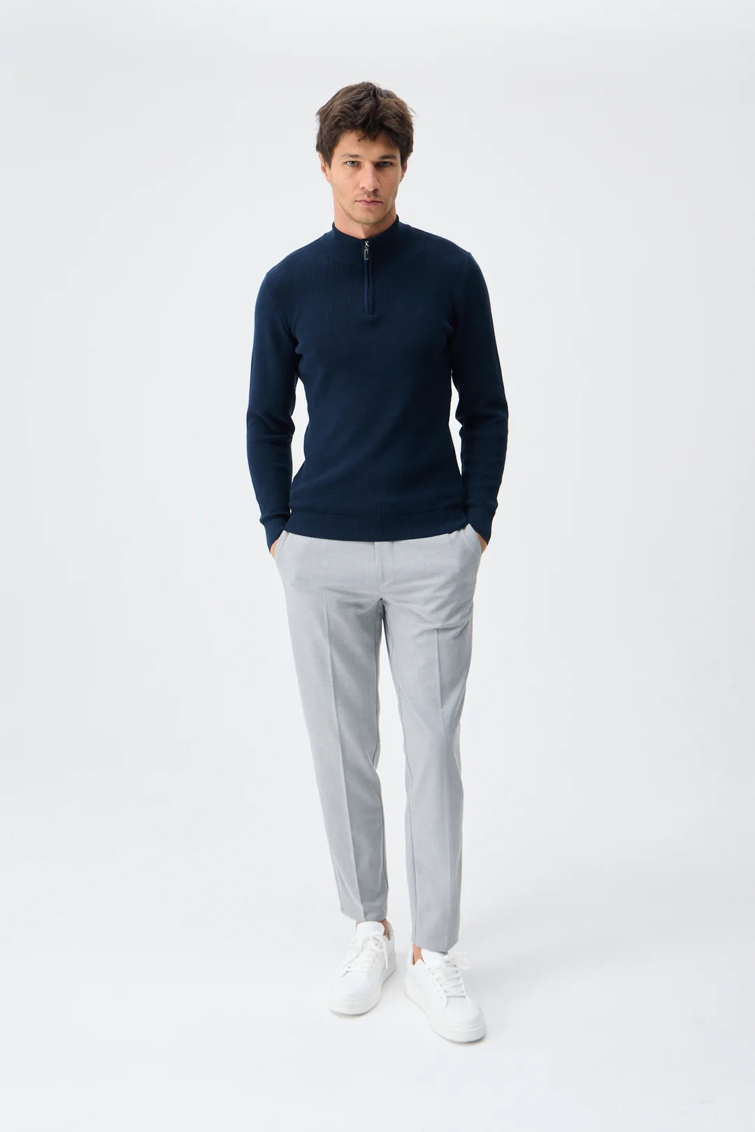 Pulover tricotat fin, cu guler înalt și fermoar la jumătate, gândit pentru eleganță de zi cu zi. Croiala lejeră și textura naturală oferă respirabilitate și confort pe tot parcursul zilei. Se poartă la fel de bine peste o cămașă sau direct pe piele și este alegerea ideală pentru sezoanele de tranziție.
