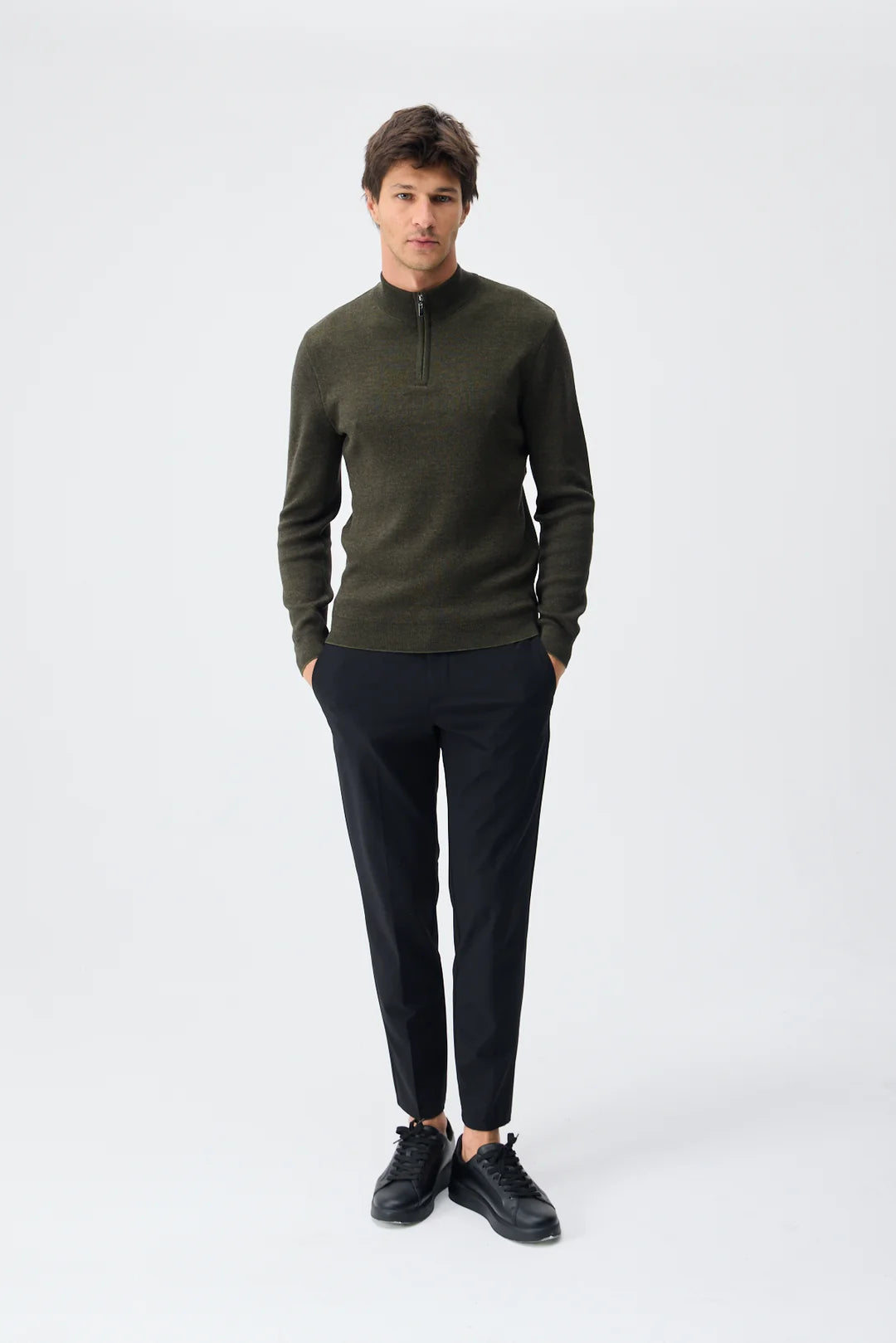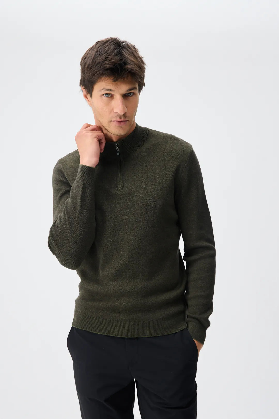 Pulover tricotat fin, cu guler înalt și fermoar la jumătate, gândit pentru eleganță de zi cu zi. Croiala lejeră și textura naturală oferă respirabilitate și confort pe tot parcursul zilei. Se poartă la fel de bine peste o cămașă sau direct pe piele și este alegerea ideală pentru sezoanele de tranziție.