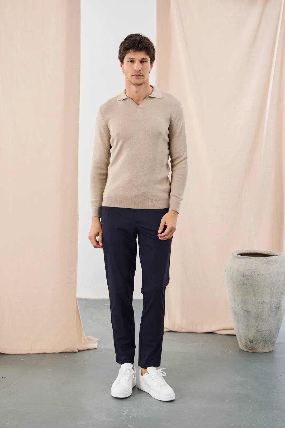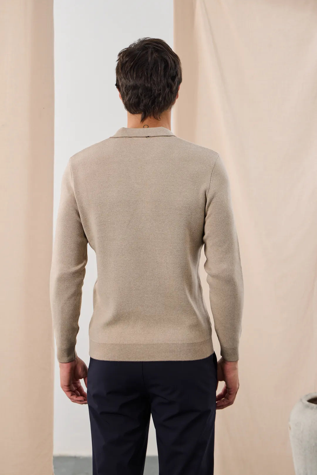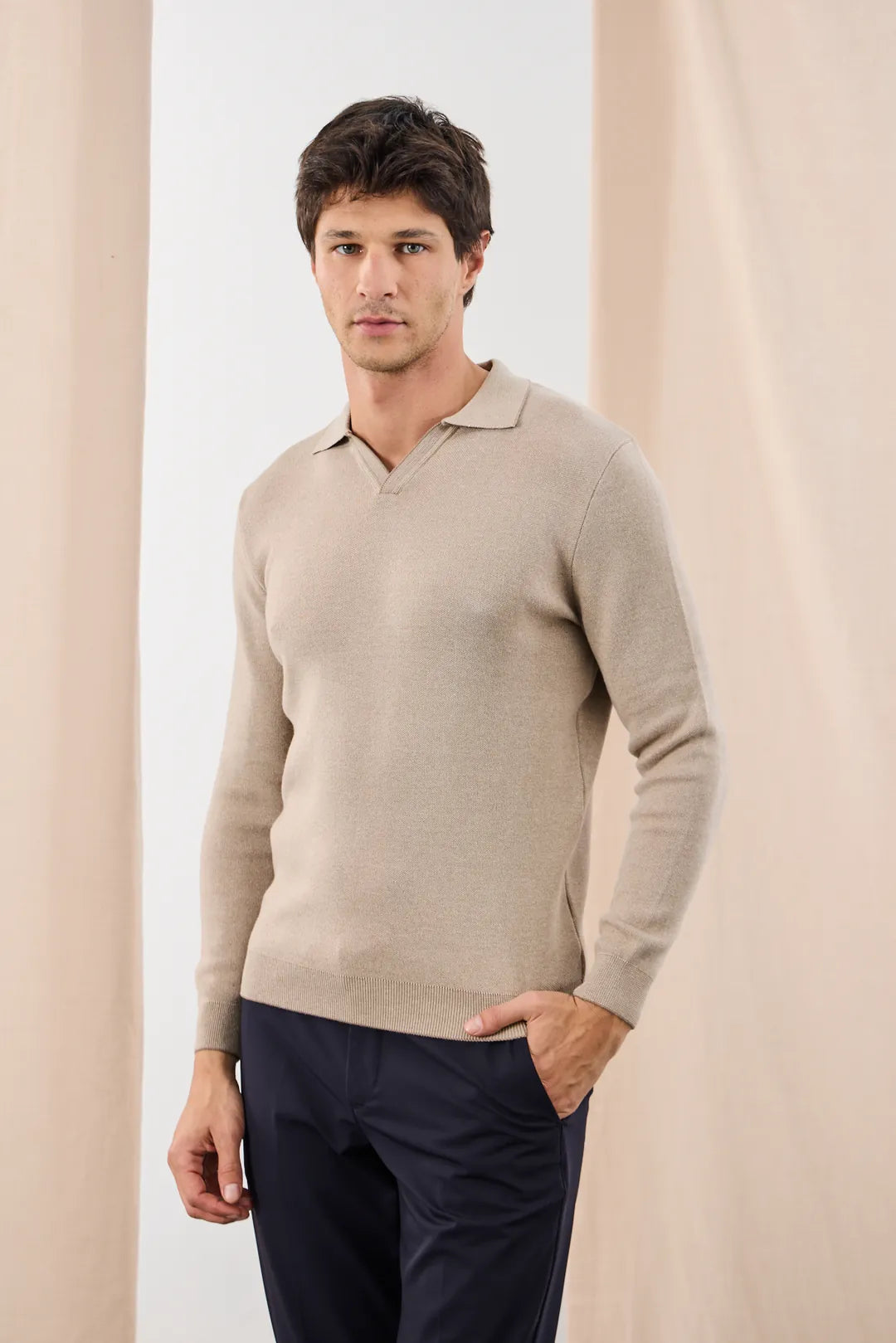 Pulover din tricot fin, cu guler deschis în V în stil polo – simplu, modern și ușor de integrat în ținute smart-casual. Textura naturală și croiul lejer îl fac confortabil pe tot parcursul zilei. Se poartă singur când e mai răcoare sau ca strat intermediar sub sacou/geacă. Manșetele și tivul tricotate păstrează forma în timp.